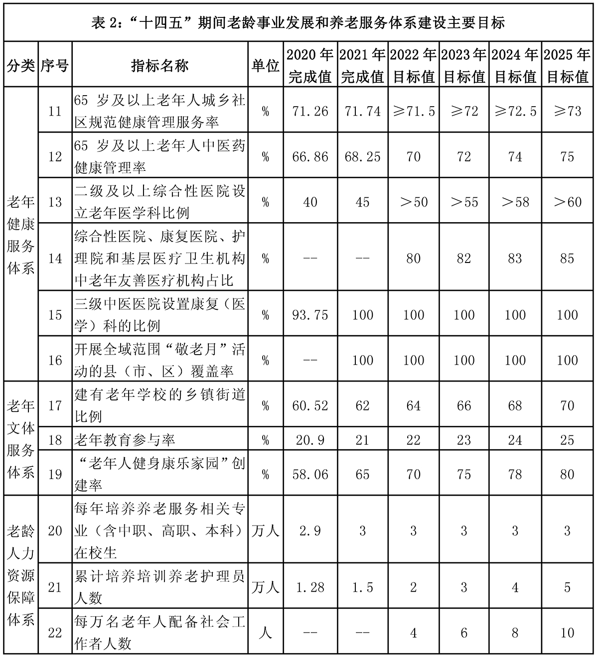 到2025年,积极应对人口老龄化的政策体系逐步完善,老龄事业和产业有效协同、高质量发展的格局初步形成。多支柱、全覆盖、更加公平、更可持续的社会保障体系趋于完善。覆盖城乡、分布均衡、功能完善、结构合理、融合健康、高效利用、惠及全民的养老服务供给进一步扩大。老年人健康需求得到基本满足,老年人健康水平不断提升,健康预期寿命不断延长。老年人教育培训、文化旅游、健身休闲、金融支持等服务不断丰富。老年人权益保障制度更加健全,老年人优待水平持续提高,老年人运用智能技术困难问题明显改善,社会环境更加适老宜居,敬老爱老助老的社会氛围日益浓厚。