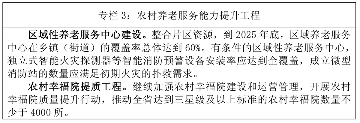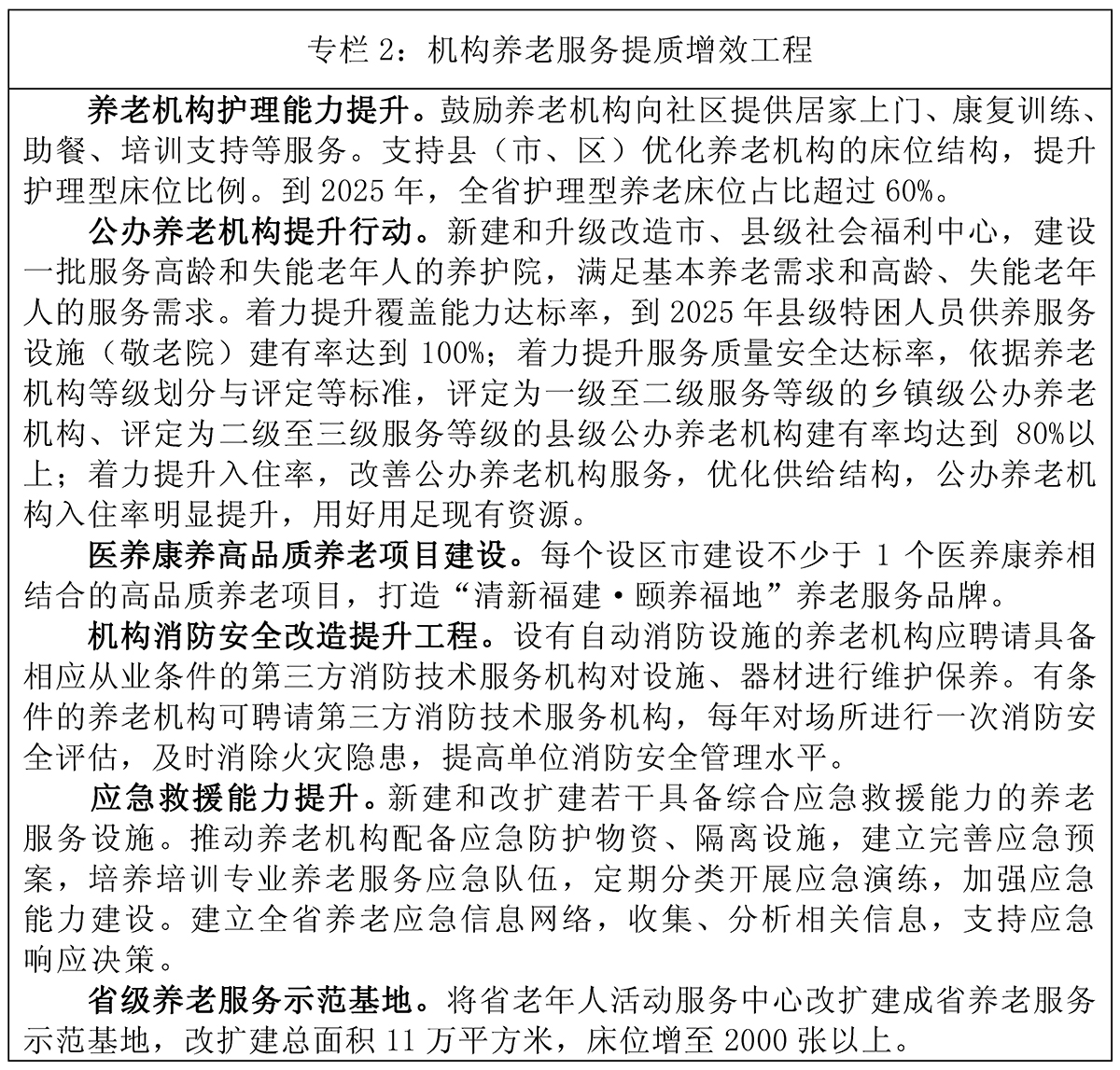2.优化城乡养老机构床位结构。聚焦高龄及失能老年人长期照护服务的刚性需求,重点扶持发展满足基本养老服务需求、服务高龄及失能老年人的养老机构,不断提高养老机构对高龄及失能老年人的照护能力。支持提高养老机构照护能力,盘活用好现有养老照护设施,建设一批服务高龄及失能老年人的养护院,满足基本养老需求和高龄、失能老年人的服务需求。着力提升护理型床位占比,到2025年全省养老机构护理型床位占比(护理型养老床位数量/养老机构总床位数量)超过60%。