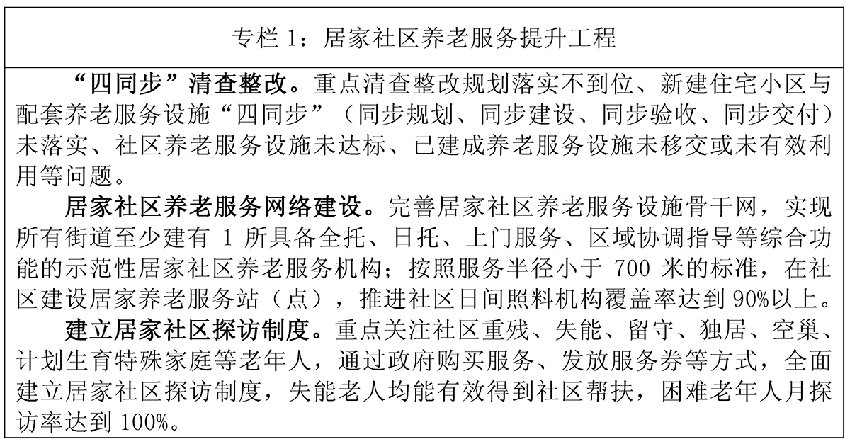 1.完善居家社区养老支持措施。地方政府负责探索并推动建立专业机构服务向社区、家庭延伸的模式。街道社区负责引进助餐、助洁等为老服务的专业机构,社区组织引进相关护理专业机构开展居家老年人照护工作,政府加强组织和监督工作。推动各地普遍建立家庭养老支持政策,支持养老服务机构将养老护理专业服务延伸到家庭,为居家老年人提供生活照料、家务料理、精神慰藉等上门服务。各级政府要培育为老服务的专业机构并指导其规范发展,引导其按照保本微利原则提供持续稳定的服务。试点探索“家庭养老床位”,完善相关服务、管理、技术等规范以及建设和运营政策,健全上门照护的服务标准与合同范本,让居家老年人享受连续、稳定、专业的养老服务。推动失能、高龄老年人家庭成员照护培训纳入政府购买养老服务目录,普及居家护理知识,增强家庭照护能力。充分发挥社区党组织作用,探索“社区+物业+养老服务”模式,大力发展老年人急需的助餐、助浴、助急、助医、助行、助洁等服务,增加居家社区养老服务有效供给。