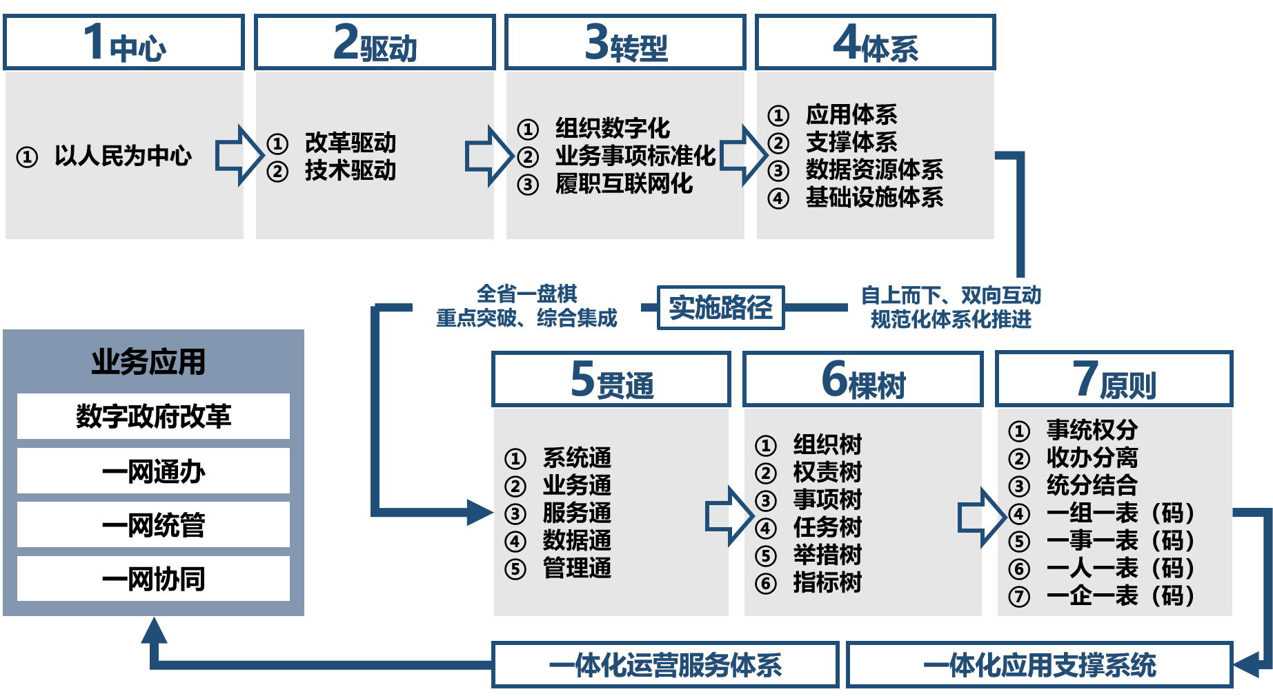 5个贯通——系统通、业务通、数据通、服务通、管理通。基于一体化基础设施体系,实现各层级系统纵向互联互通、各协同系统横向互联互通、新旧系统互联互通、端到端互联互通,全面实现系统通。基于业务标准化协同化转型,实现业务事项标准化,推动工作任务通、业务事项通、指标体系通、工作信息通,事项、任务、指标、信息相互关联、环环相扣,全面实现业务通。通过数据实时化、任务数据通、业务数据通、服务数据通、基础数据通,打破数据壁垒,全面实现数据通。在系统通、业务通、数据通的基础上,打造服务一致化、前台受理通、后台办理通、服务流程通、问题反馈通的全业务闭环服务通。基于政府履职智能化转型的成果,实现互联网管理数字化、任务管理数字化、业务管理数字化、服务管理数字化、监督考核数字化的全方位管理通。