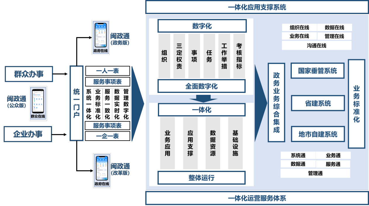 围绕“对内好办公”,建设省级一体化协同办公平台、闽政通(政务版)APP,以统一服务入口、统一身份认证、统一办公门户、统一沟通协作为基础支撑,建立数字化决策机制体系,推进机关内部整体协同、高效运行、科学决策。
