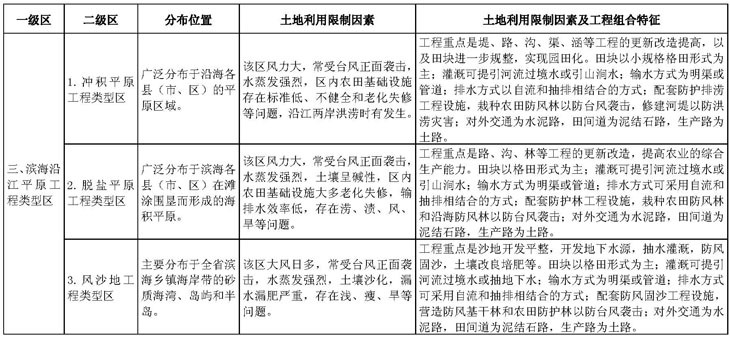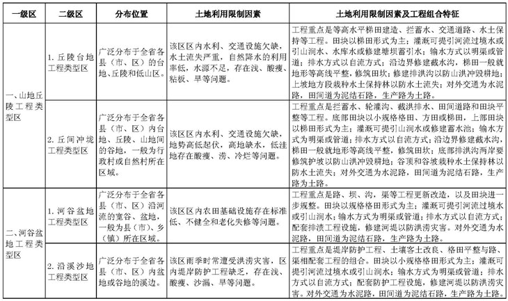 为合理组织高标准农田项目工程建设,依据地形地貌和耕地质量障碍特点,将全省分为3个一级工程类型区和7个二级工程类型区,并根据各工程类型区土地利用限制因素配套相应的工程措施,具体见附件。