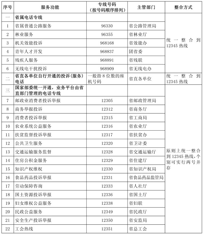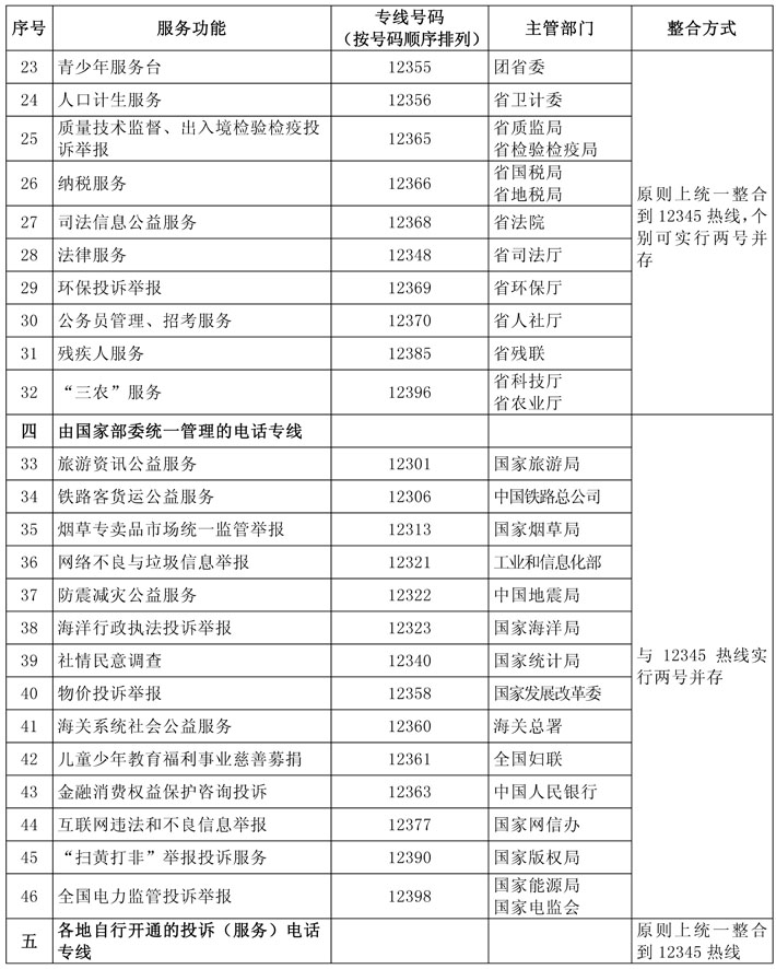 第四条 按照便民服务专线清单,结合各地实际,整合12345热线电话与各类便民服务诉求电话,个别暂时不能整合的,可实行两号并存、数据共享、统一监管。