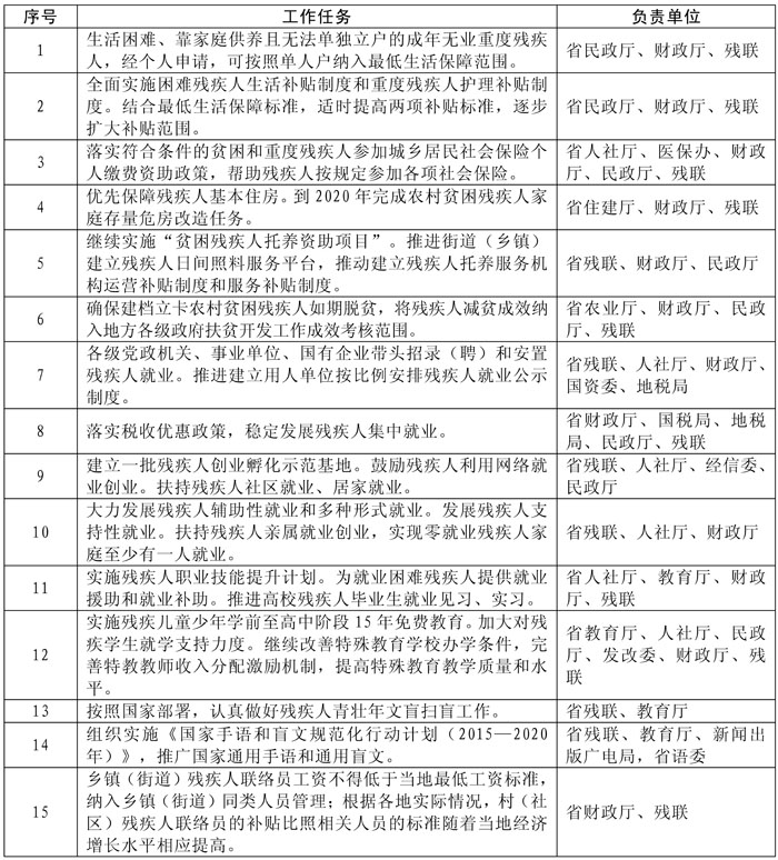 1.确保农村贫困残疾人如期脱贫。制定实施我 省贯彻《贫困残疾人脱贫攻坚行动计划(2016-2020年)》实施办法。将农村贫困残疾人作为重点群体纳入政府扶贫攻坚规划,统筹安排 ,同步实施。切实摸清贫困残疾人基本状况和需求状况,做好帮扶对接,将符合条件的农村贫困残疾人全部纳入精 准扶贫建档立卡范围和“五个一批”帮扶措施,实行分类施策和精准帮扶,政策、项目向农村贫困残疾人倾斜。无 法通过开发性扶贫措施实现脱贫的贫困残疾人全部纳入低保给予兜底保障。驻村干部要将残疾人贫困户作为重点帮 扶对象,选好配强帮扶责任人。将残疾人减贫成效纳入各级政府扶贫开发工作成效考核范围。