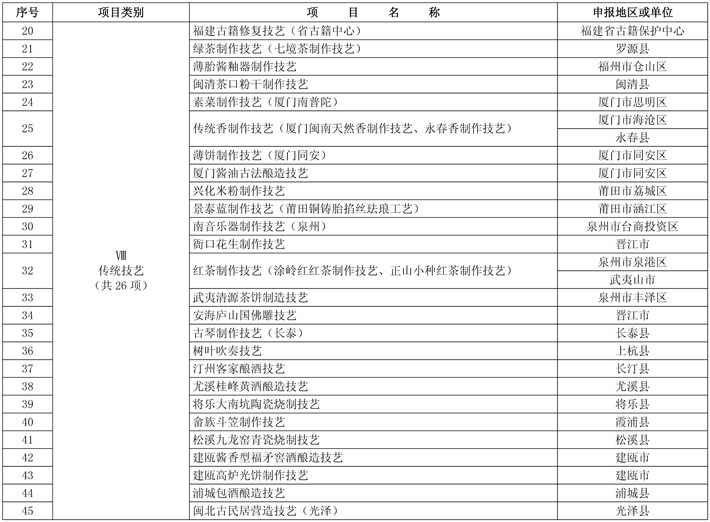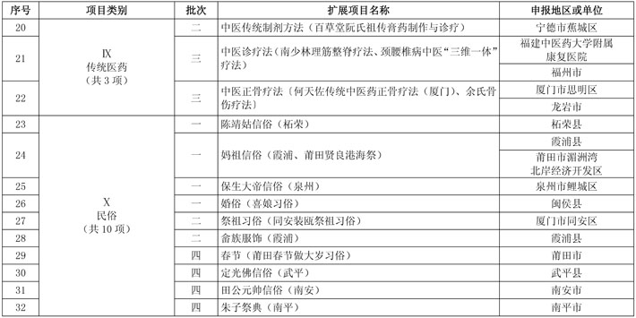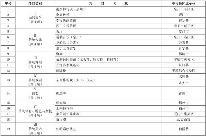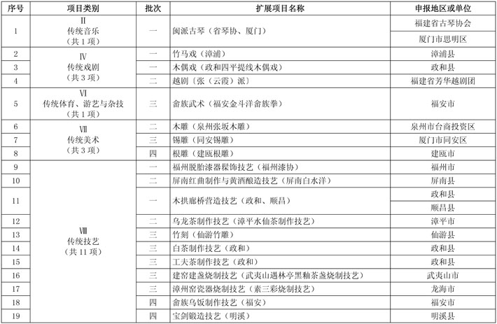 根据《中华人民共和国非物质文化遗产法》《福建省民族民间文化保护条例》有关规定,经研究,同意省文化厅组织专家评审后提出的第五批省级非物质文化遗产代表性项目名录(共计57项),以及第一批至第四批省级非物质文化遗产代表性项目名录扩展项目名录(共计32项),现予以公布。