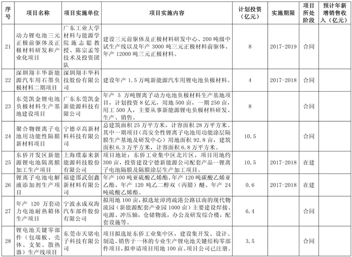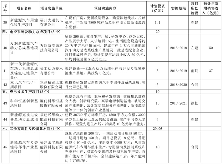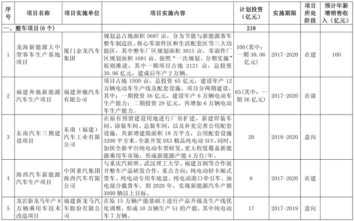 新能源汽车产业重点项目表