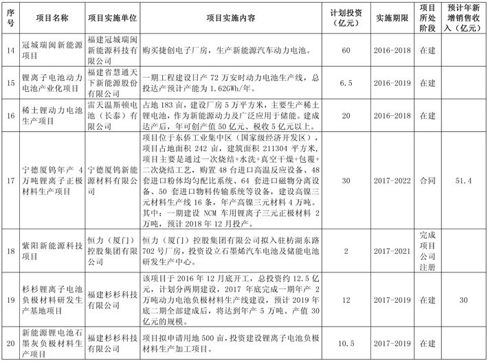 1.动力电池方面。加快完成宁德时代新能源二、三期项目建设。以宁德时代新能源为核心,积极推动动力电池、储能电池及关键原辅材料等产业链拓展,加快推进产业链投资项目建设。支持漳州猛狮新能源科技、漳州雷天温斯顿、福清冠城瑞闽、南平巨电及厦门国安达动力电池安全系统等动力电池及安全系统生产企业发展和项目建设。到2020年形成产值700亿元的全球最大锂电新能源产业基地。