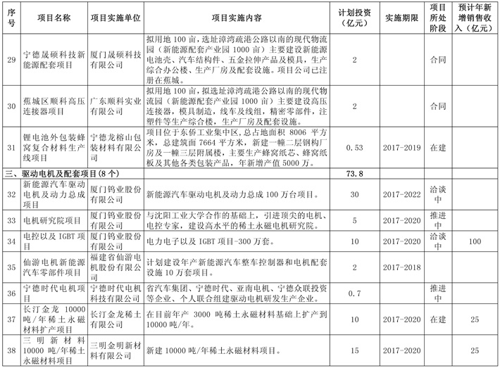 2.电机方面。支持厦门钨业稀土永磁材料向下游应用技术延伸,大力发展车用永磁电机产业。推动省汽车集团与宁德时代新能源及亚南电机合作布局驱动电机项目;支持仙游电机等新能源车用驱动电机企业研发新能源车用驱动电机。到2020年,实现产值312亿元。