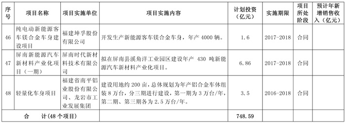 4.核心材料方面。支持以海源机械、南铝为龙头的先进轻量化材料企业在碳纤维车身、铝合金车身应用技术方面的突破,为新能源汽车减重、降耗做好强大的技术储备。在动力电池原材料方面,加快推进厦门钨业动力电池正极材料、福建杉杉科技动力电池负极材料、宁德卓高动力电池隔膜新材料等项目建设。到2020年,实现产值213亿元。