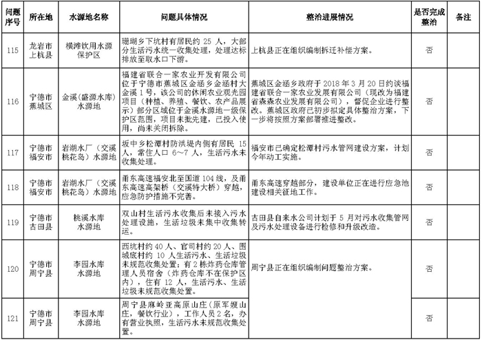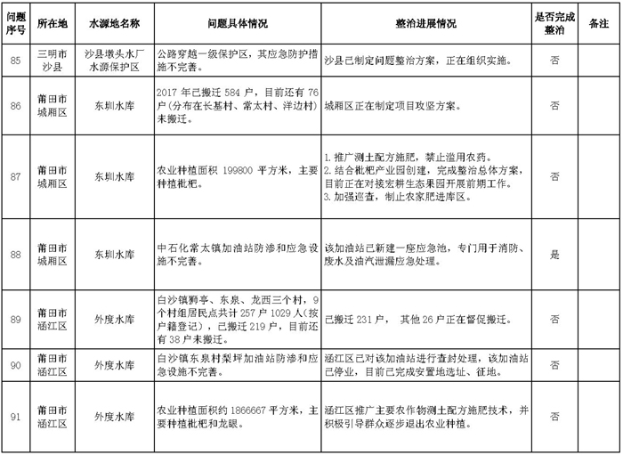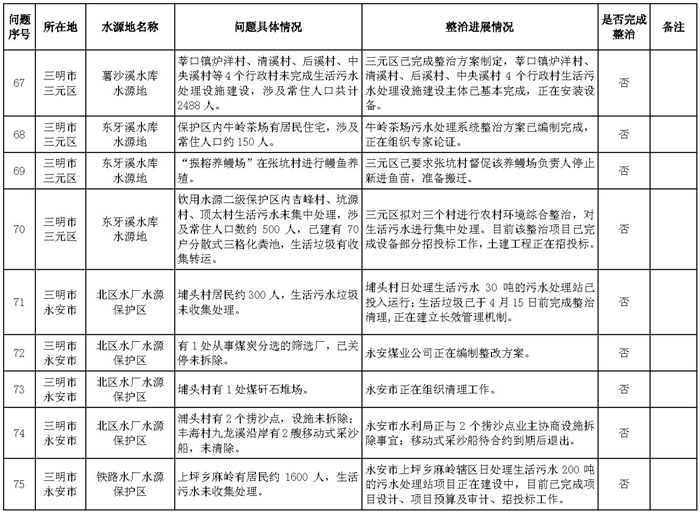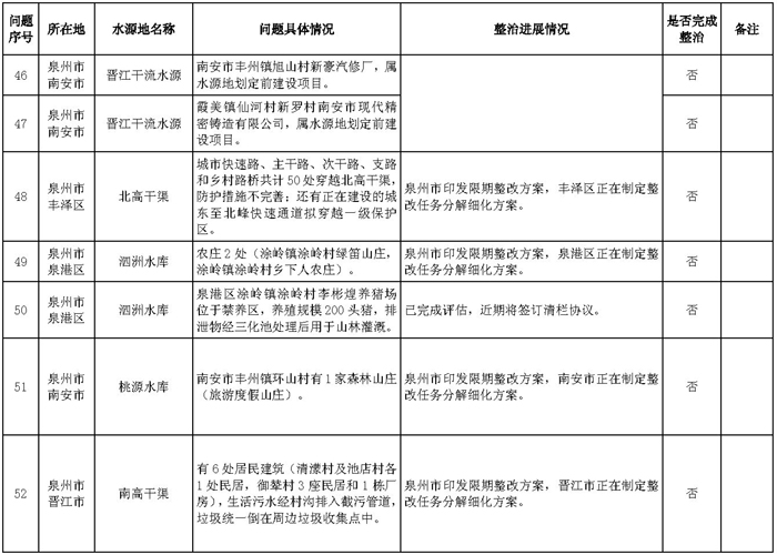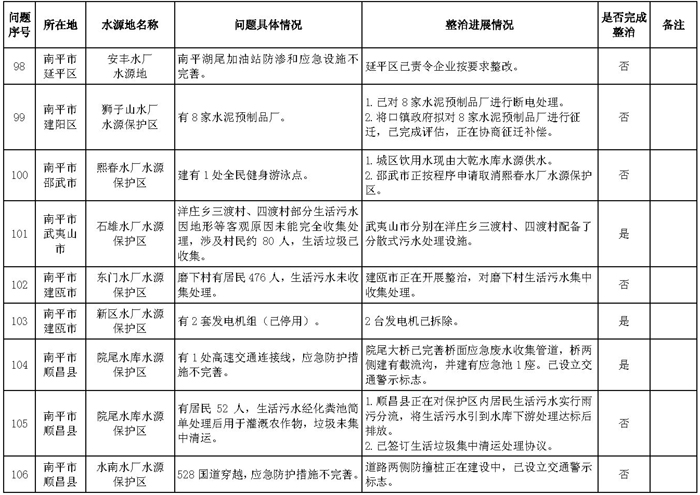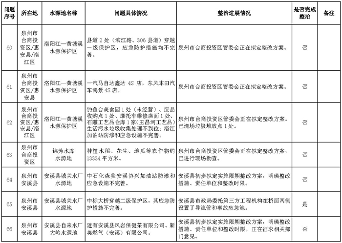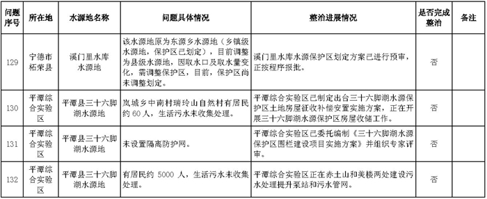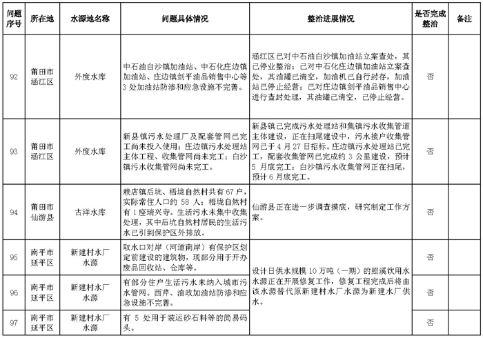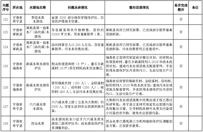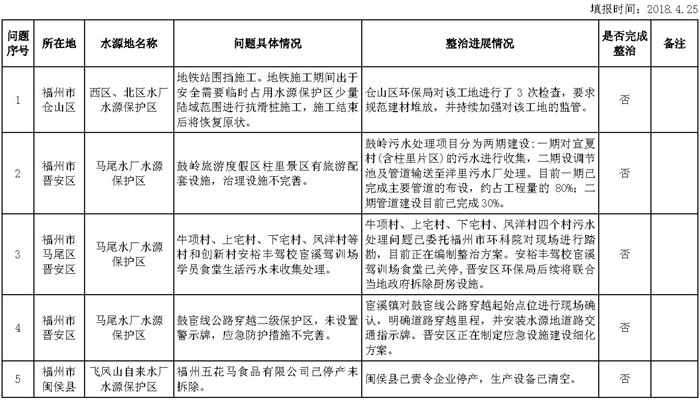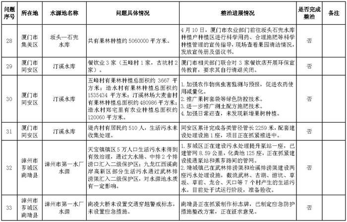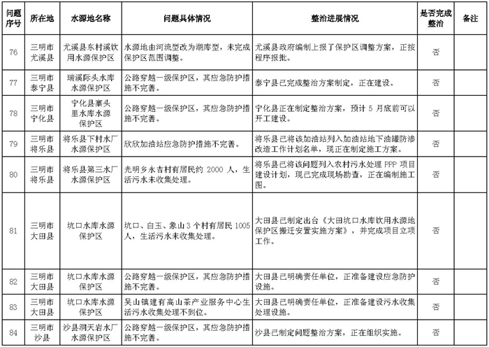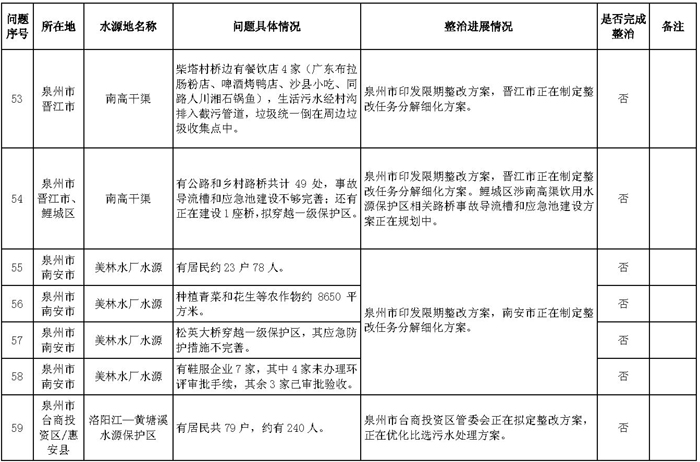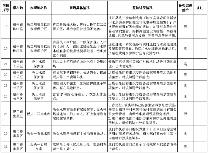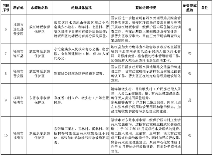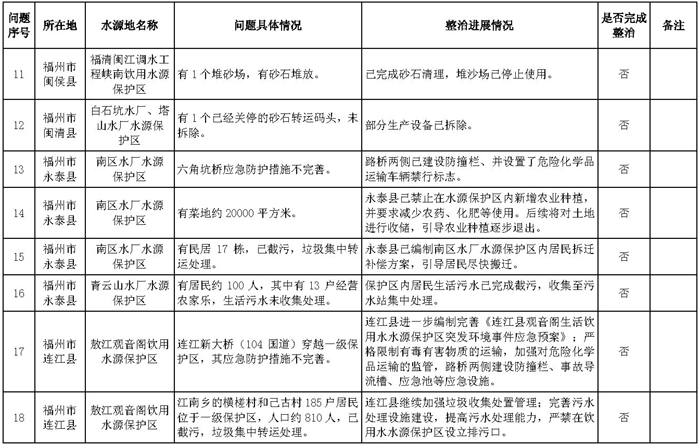 福建省饮用水水源地环境问题清理整治进展情况统计表