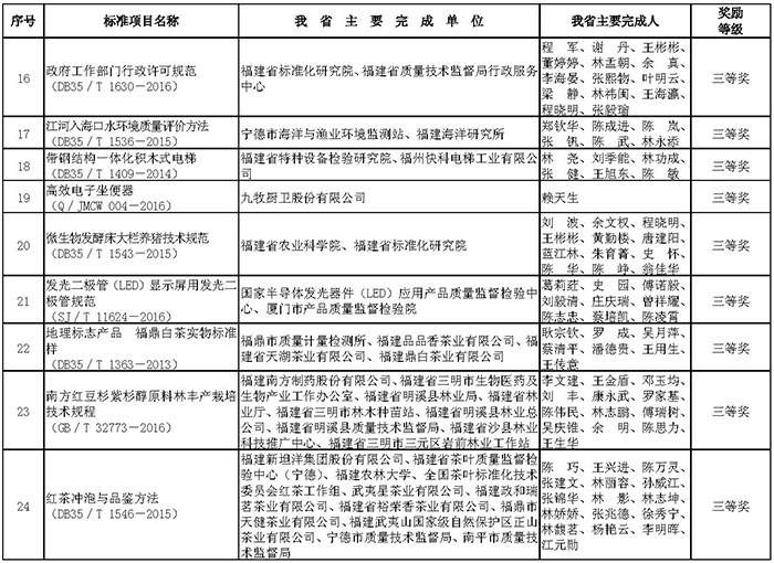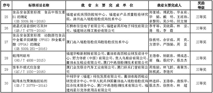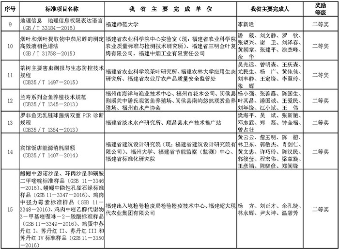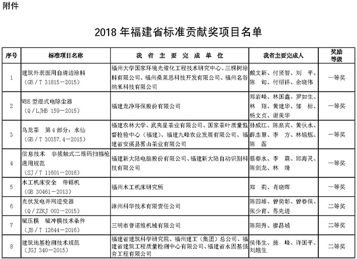 根据福建省标准贡献奖评审程序,经省标准贡献奖励委员会评审,省政府同意授予《建筑外表面用自清洁涂料》(GB/T 31815-2015)等30项标准“2018年福建省标准贡献奖”称号,其中一等奖5项、二等奖10项、三等奖15项(具体名单见附件)。