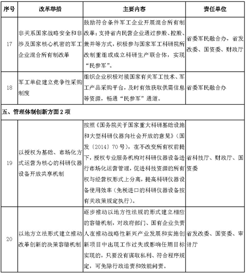 按照国务院办公厅要求,我省对落实推广知识产权保护、科技成果转化激励、科技金融创新、军民深度融合以及管理体制创新等5方面20项改革举措进行了任务分工。经省政府领导同意,现将《推广第二批支持创新相关改革举措的任务分工》印发给你们,请认真贯彻执行。