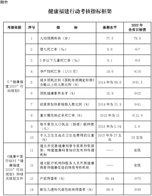(三)考核指标。围绕《“健康福建2030”行动规划》等主要指标要求,兼顾数据的可获得性,建立相对稳定的考核指标框架(见附件)。各设区市、平潭综合实验区在对下一级进行考核时,可根据本地实际情况对考核指标进行调整完善。