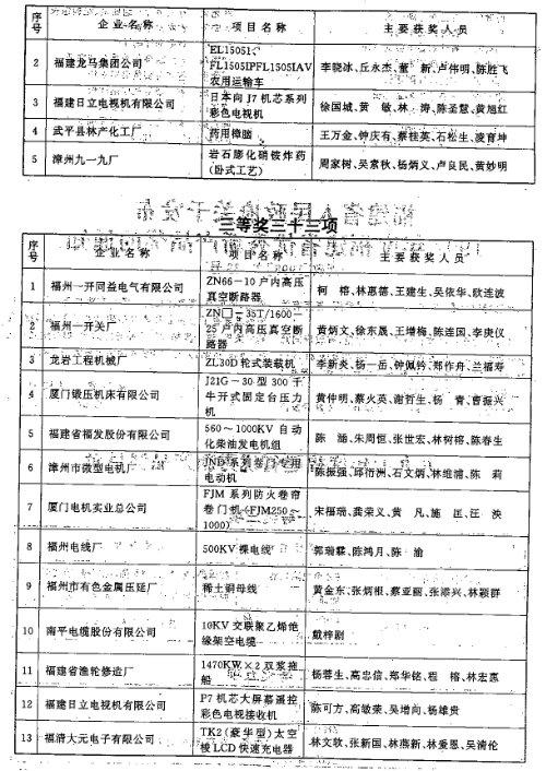 经省优秀新产品奖评审委员会评定,省政府同意授予福建龙净企业集团公司BE型电除尘器等41项产品为1997年度福建省优秀新产品称号,其中一等奖3项,二等奖5项,三等奖33项。
