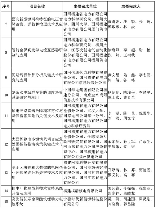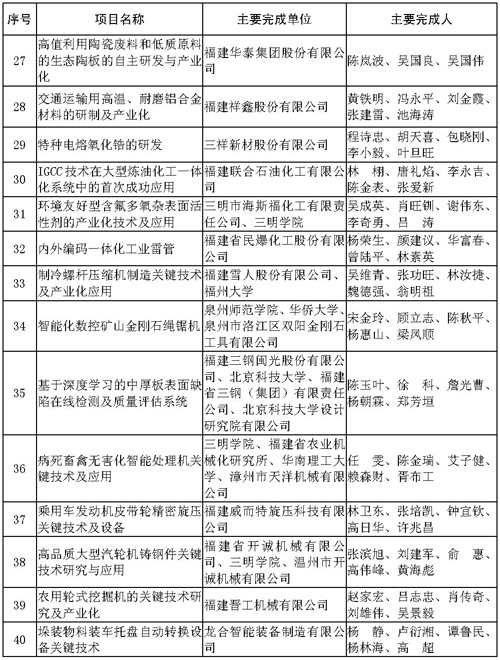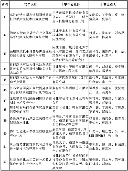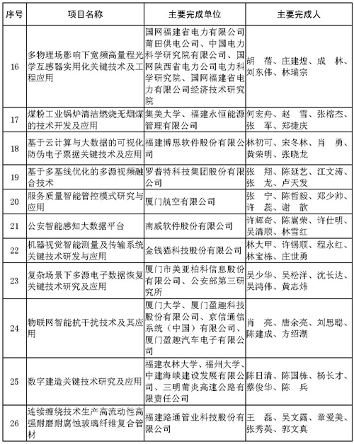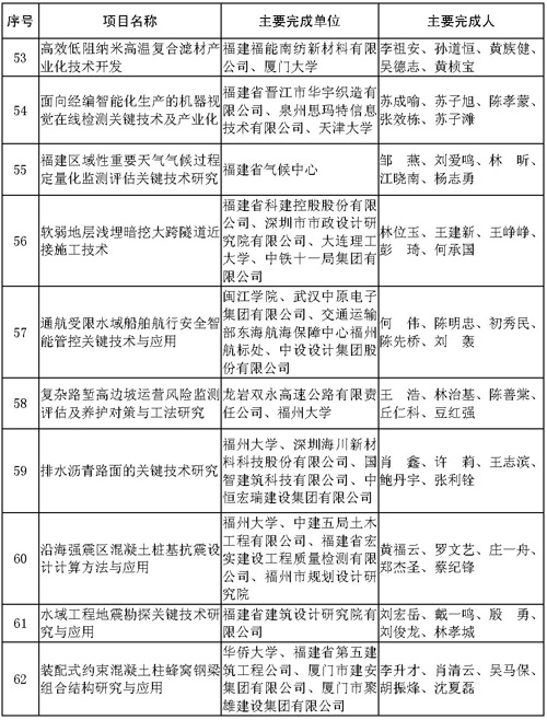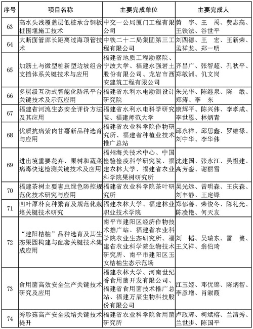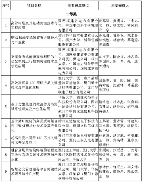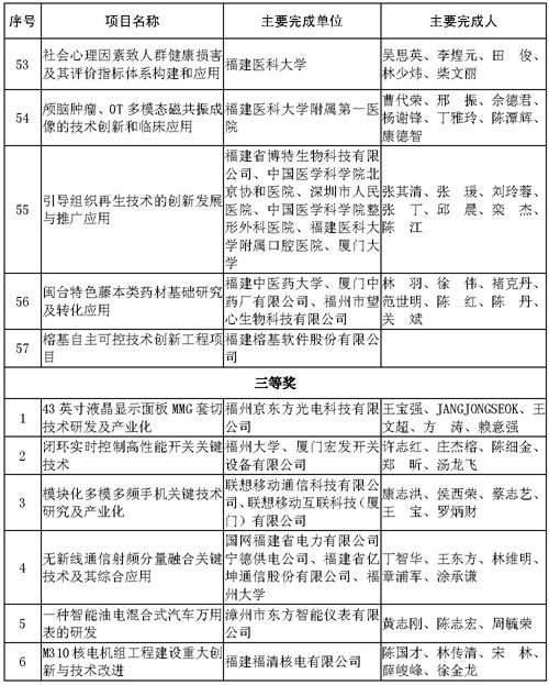 三、授予“基于64位8核处理器的移动互联终端SoC芯片”等25项成果福建省科学技术进步奖一等奖,授予“高耸杆塔及其基础关键技术与工程应用”等57项成果福建省科学技术进步奖二等奖,授予“43英寸液晶显示面板MMG套切技术研发及产业化”等94项成果福建省科学技术进步奖三等奖。