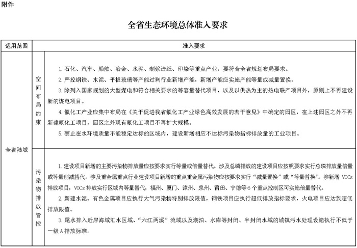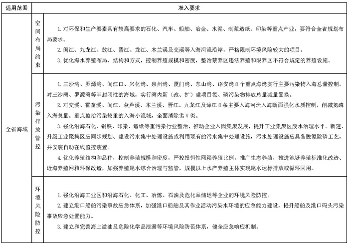 基于生态保护红线、环境质量底线、资源利用上线,依据现有法律法规、政策标准和管理要求等,衔接区域发展战略和生态功能定位,坚持目标导向和问题导向,从空间布局约束、污染物排放管控、环境风险防控和资源利用效率等方面明确允许、限制和禁止的要求,建立“1+10+N”三级生态环境准入清单。“1”为全省陆域、海域的总体准入要求,突出重点流域、重点湾区;“10”为9个设区市和平潭综合实验区的陆域、海域总体准入要求;“N”为陆域和海域具体单元的准入要求。