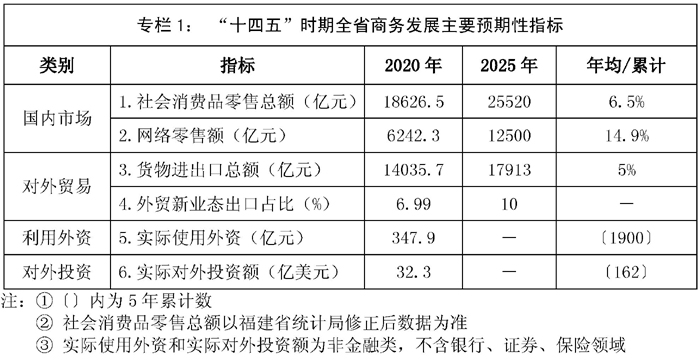 “十四五”时期将努力实现:服务建设国内强大市场取得新成效,现代商贸流通体系日趋完善,居民消费持续扩容提质,新型消费不断壮大。推动高水平开放迈出新步伐,循环畅通能力得到新提升。外贸高质量发展进程加快,新业态规模持续壮大。利用外资质量明显提升,一批高端制造业和现代服务业项目落地。对外投资合作健康有序发展,优势行业企业全球配置资源能力增强。自贸试验区系统集成创新成效显著,重点平台、重点产业支撑作用增强,市场化、法治化、国际化营商环境更加优化。闽台港澳经贸合作全面深化。