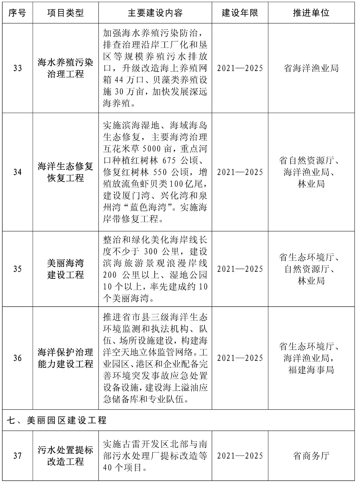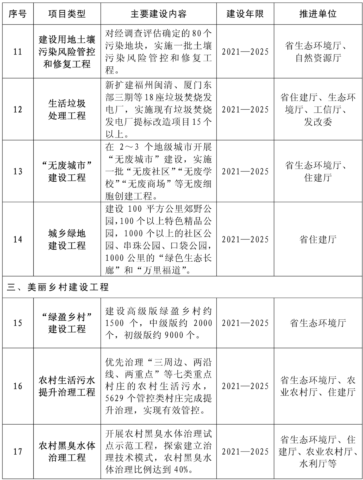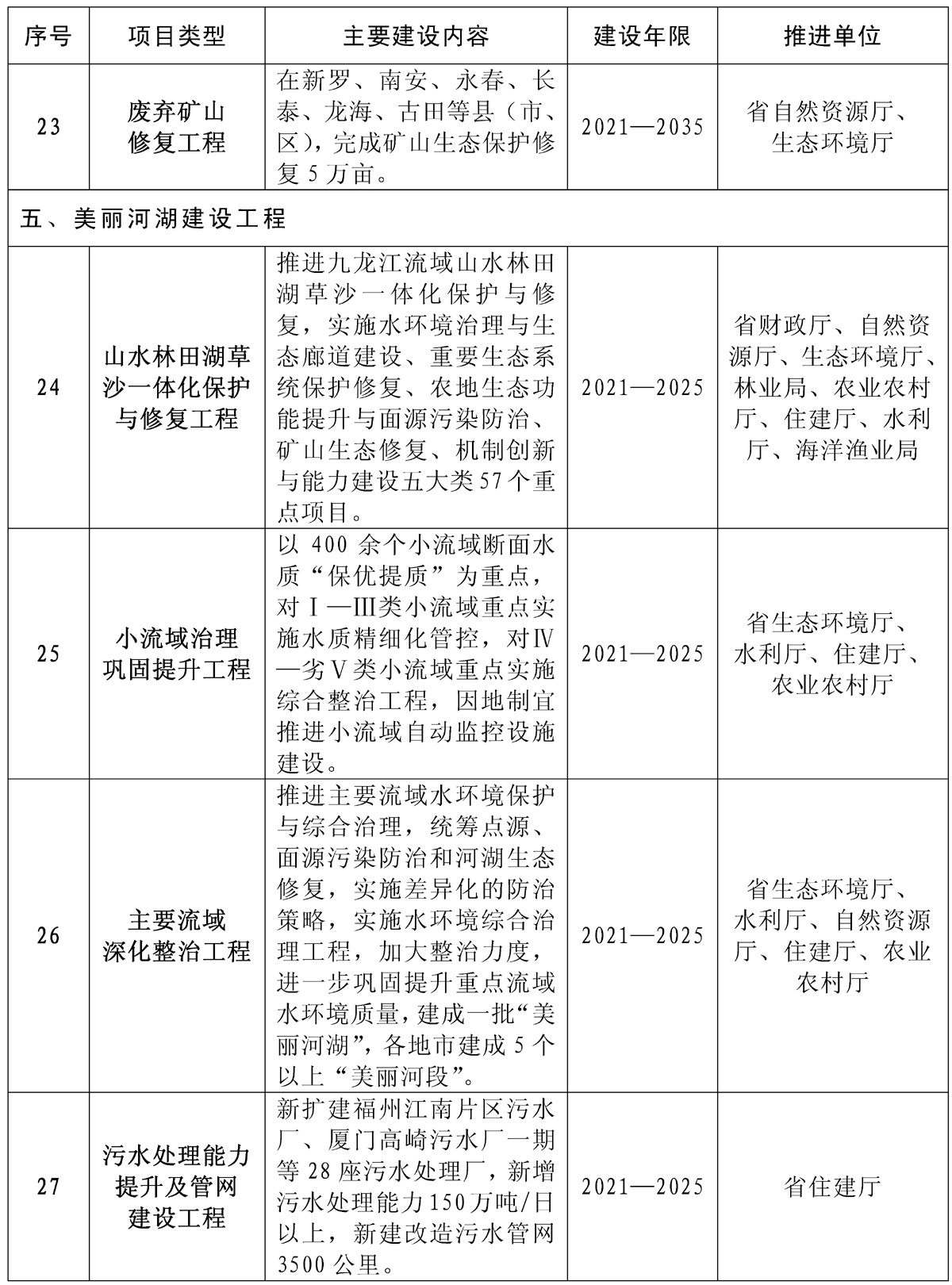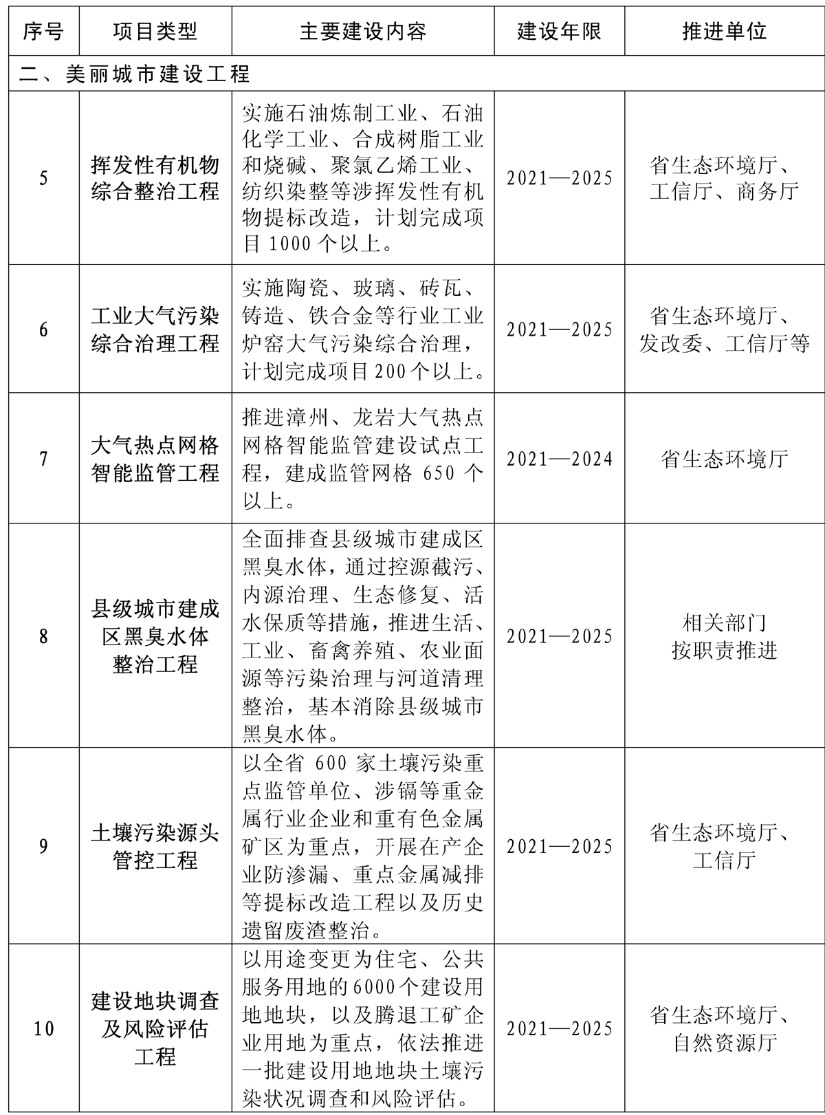 锚定2035年生态福建美丽福建建设目标,围绕建设践行习近平生态文明思想先行示范区和美丽中国示范省份,落实党中央碳达峰、碳中和决策部署,一手抓环境治理加强生态保护修复,一手抓体制机制创新激发内生动力,推动由相对偏重简单粗放治理向更加精准、科学、依法治理转变,由偏重单一环境要素治理向更加系统、集成、综合治理转变,由偏重末端治理向更加注重源头、绿色、低碳转变。实施蓝天、碧水、碧海、净土四大工程,推进美丽城市、美丽乡村、美丽河湖、美丽海湾、美丽园区建设,为建设美丽福建开好局、起好步。