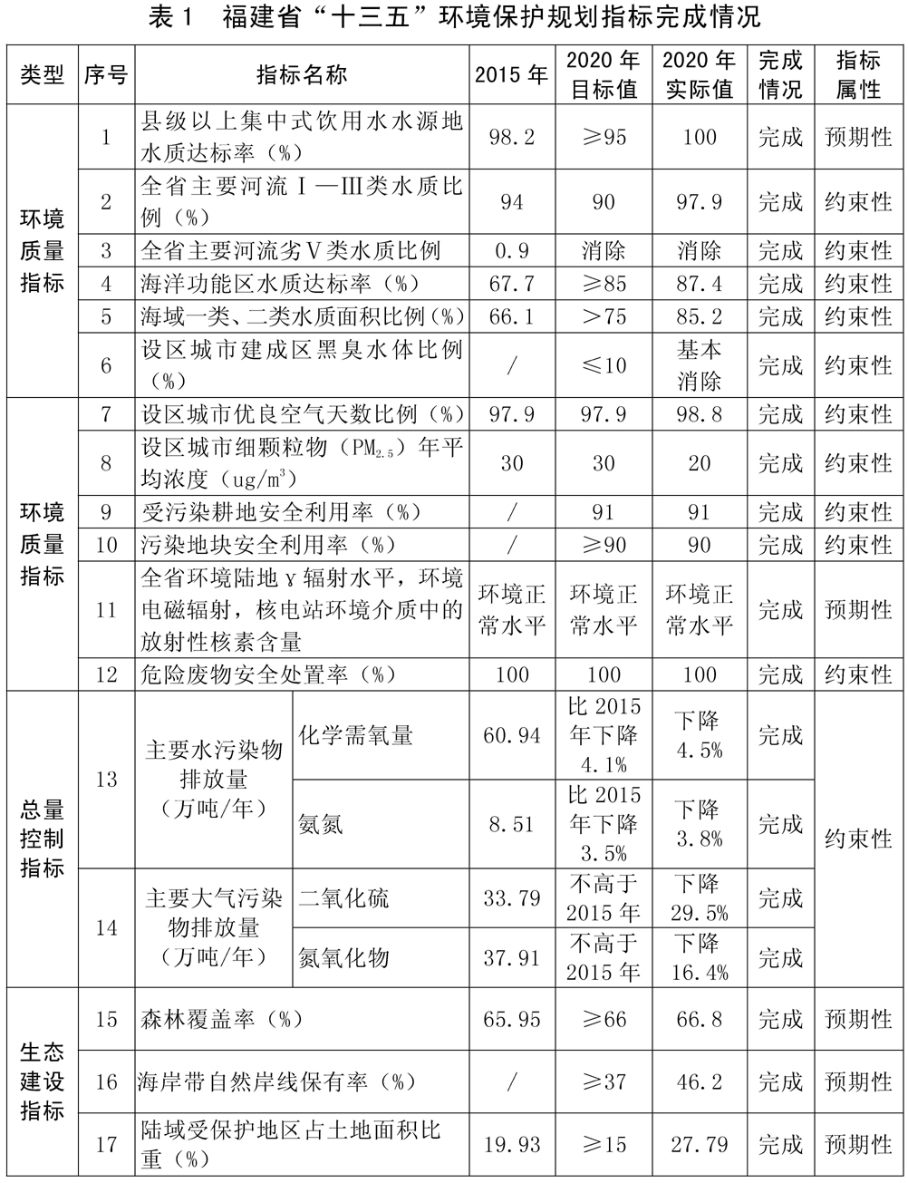 “十三五”时期,在习近平新时代中国特色社会主义思想的科学指引下,福建省委和省政府深入贯彻落实习近平生态文明思想,一以贯之、坚定不移沿着习近平总书记指引的方向前进,坚决扛起生态文明建设政治责任,切实把生态环境保护工作摆在更加突出位置,坚决打好污染防治攻坚战,生态环境优势进一步凸显,“十三五”生态环境保护规划实施成效显著,主要目标任务均顺利完成(详见表1)。
