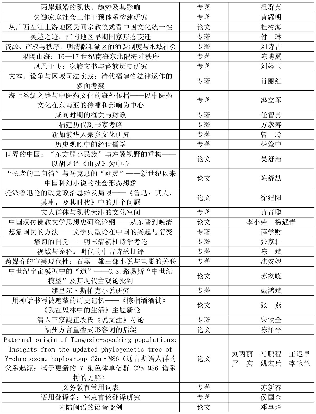 根据《福建省第十四届社会科学优秀成果奖评审实施办法》,经学科组评审、意识形态审读、专家组票决、省评委会研究通过和获奖成果公示,省人民政府决定授予《新时代“三大法宝”论——中华民族伟大复兴战略研究》等30项成果福建省第十四届社会科学优秀成果一等奖,《改革开放以来巡视制度重构的阶段、特征及理论逻辑》等104项成果福建省第十四届社会科学优秀成果二等奖,《文化自信:中国力量的精神支撑》等171项成果福建省第十四届社会科学优秀成果三等奖,并按有关奖励规定,分别颁发证书、奖金。