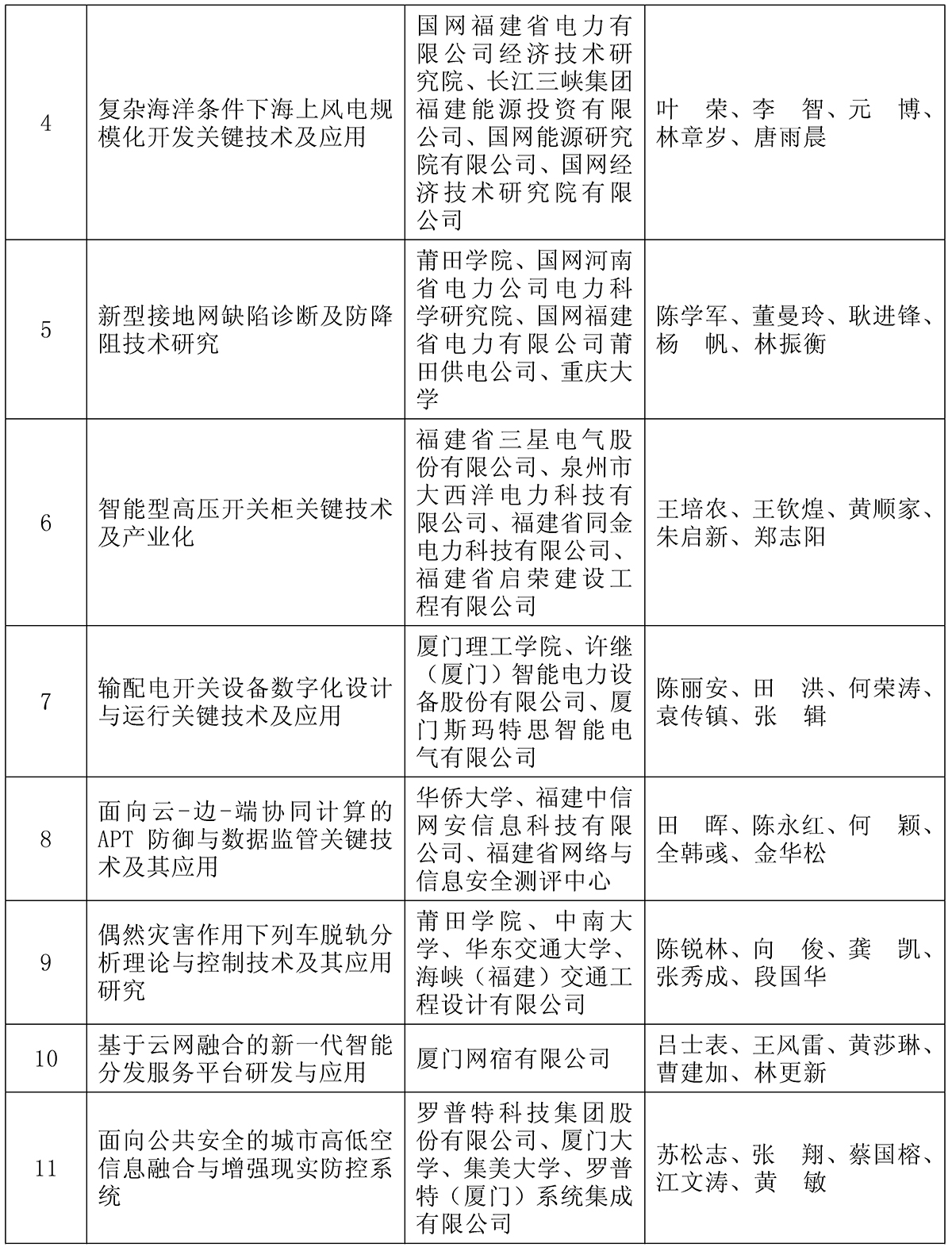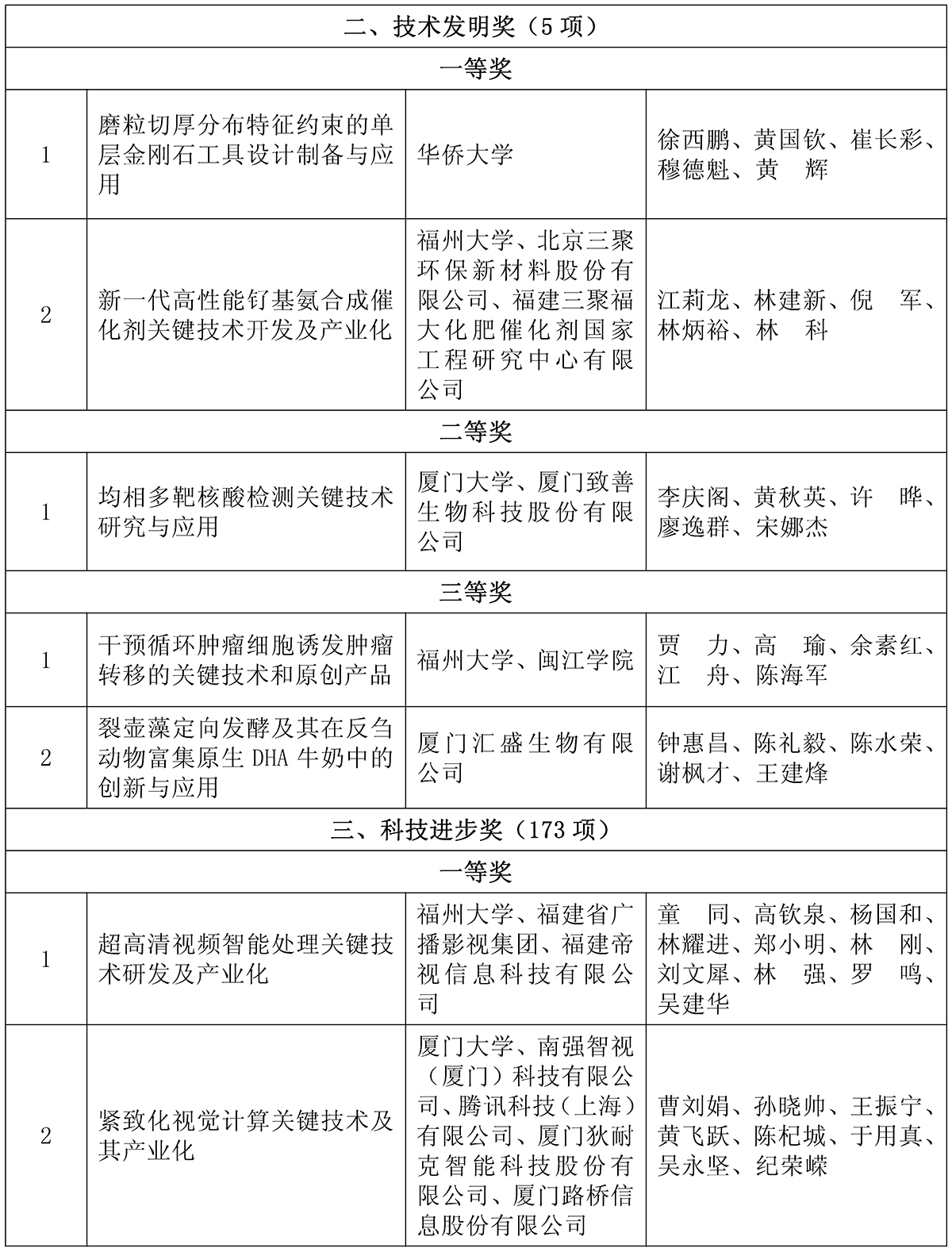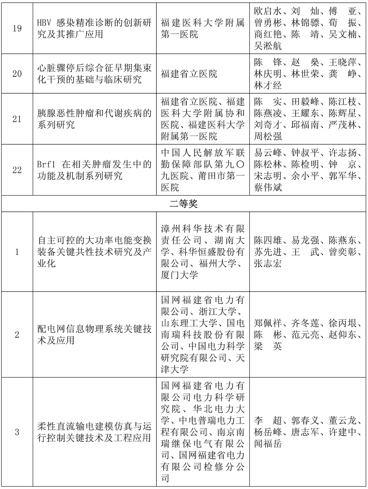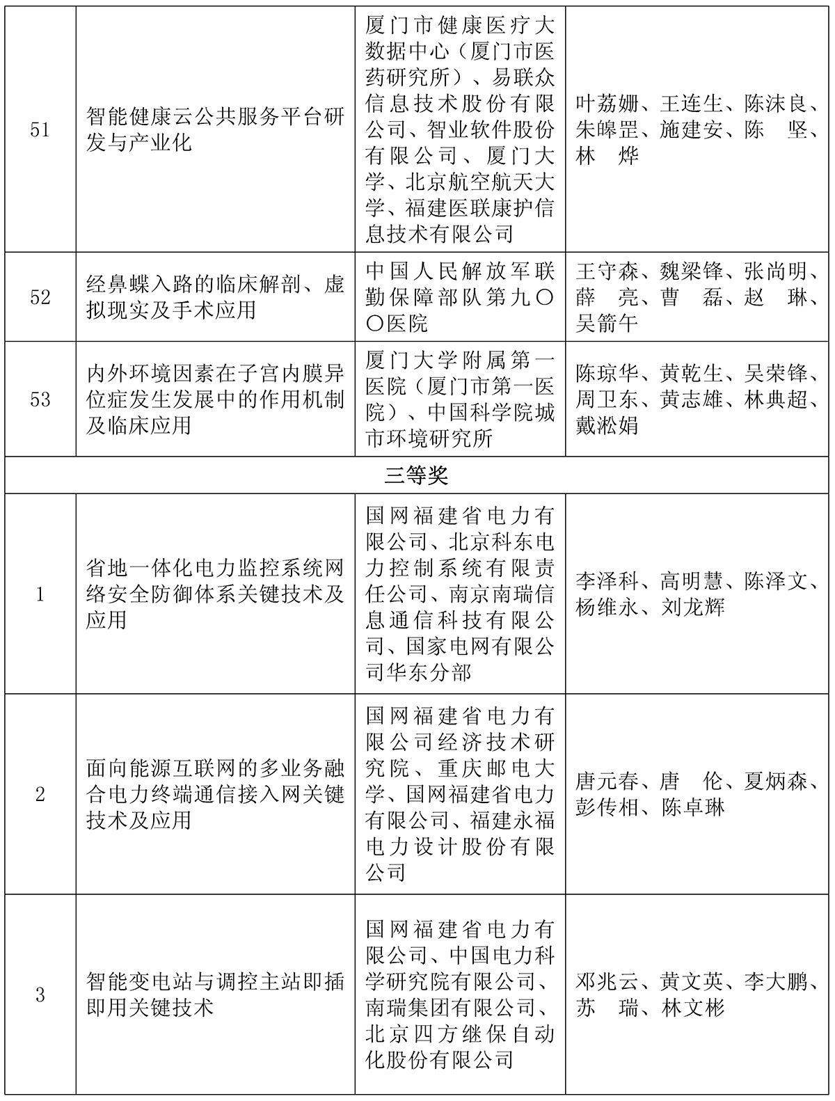 三、授予“超高清视频智能处理关键技术研发及产业化”等22项成果福建省科学技术进步奖一等奖,授予“自主可控的大功率电能变换装备关键共性技术研究及产业化”等53项成果福建省科学技术进步奖二等奖,授予“省地一体化电力监控系统网络安全防御体系关键技术及应用”等98项成果福建省科学技术进步奖三等奖。