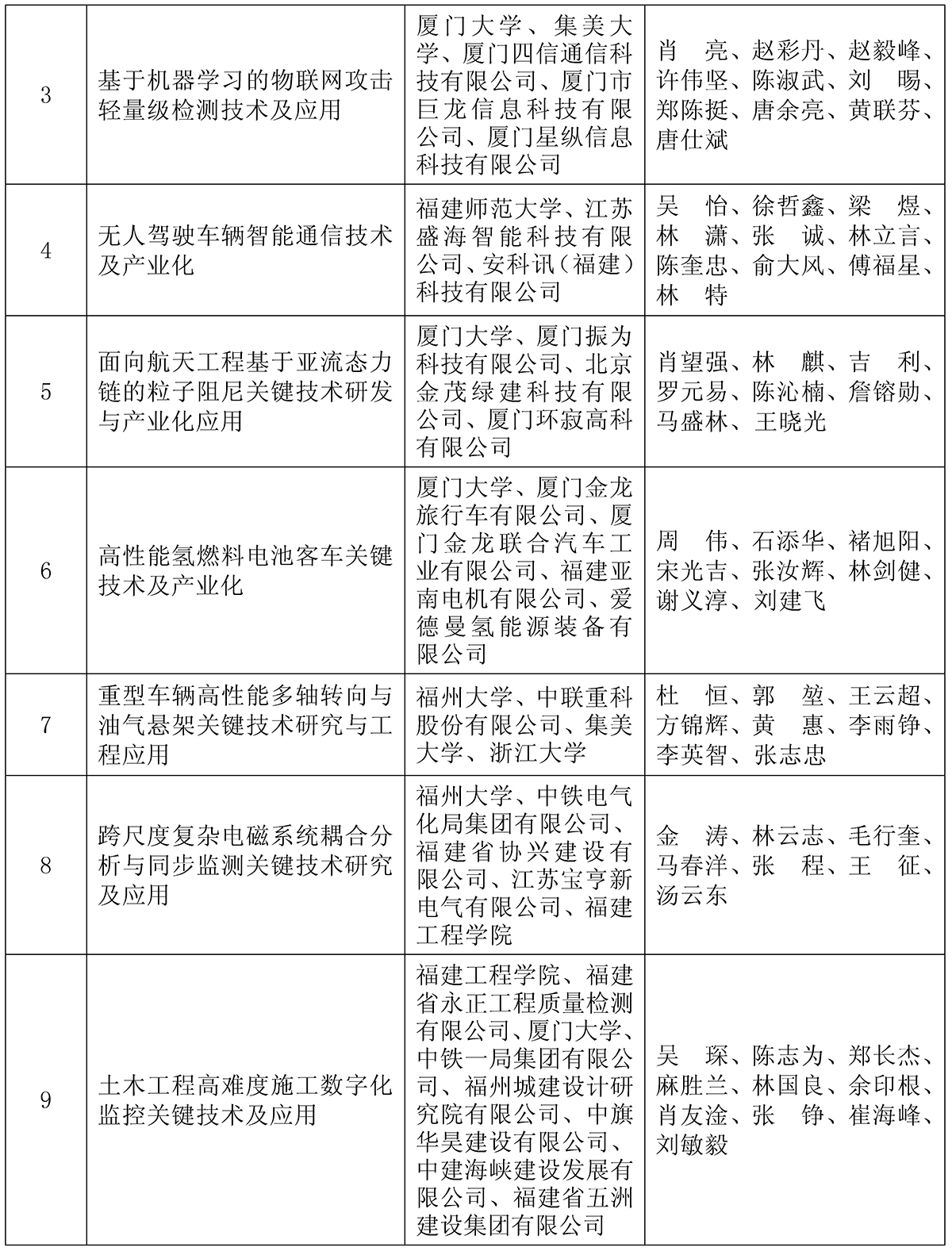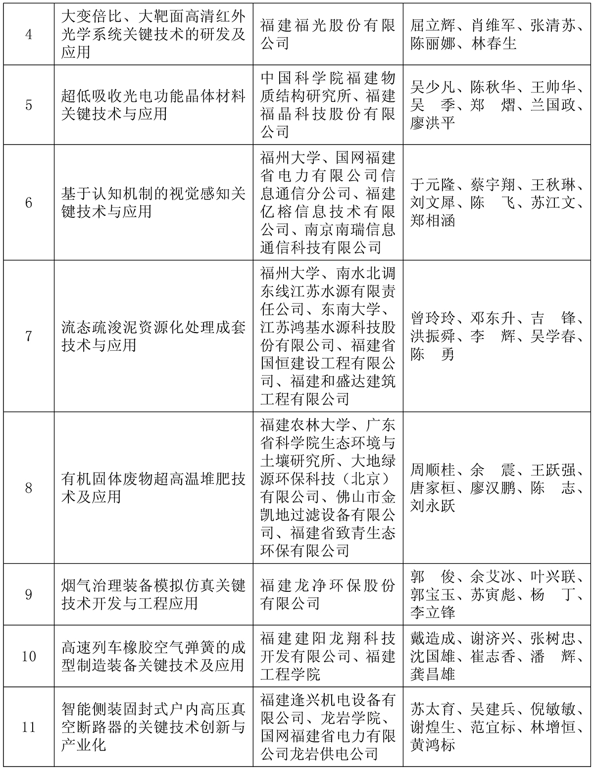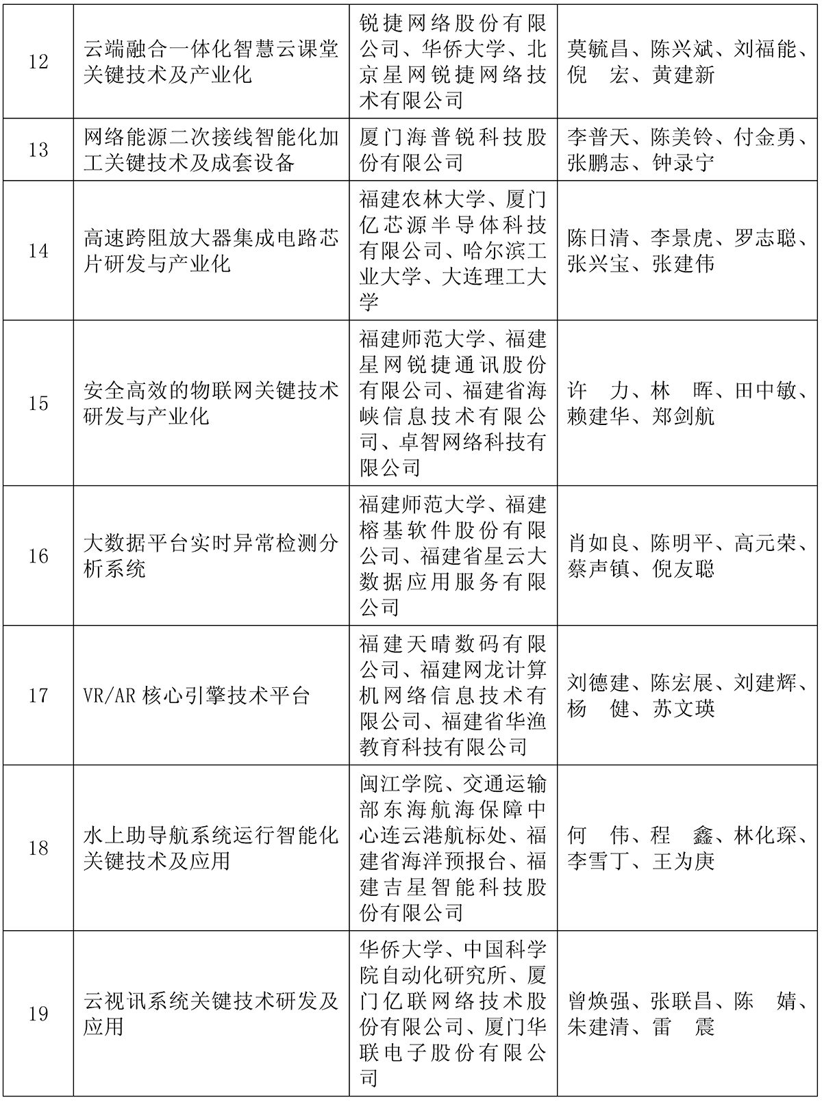 三、授予“超高清视频智能处理关键技术研发及产业化”等22项成果福建省科学技术进步奖一等奖,授予“自主可控的大功率电能变换装备关键共性技术研究及产业化”等53项成果福建省科学技术进步奖二等奖,授予“省地一体化电力监控系统网络安全防御体系关键技术及应用”等98项成果福建省科学技术进步奖三等奖。