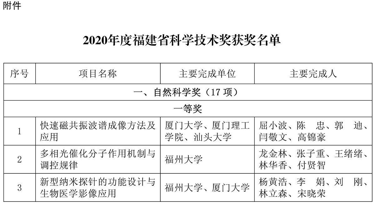 为深入贯彻落实习近平新时代中国特色社会主义思想,全面贯彻党的十九大和十九届历次全会精神,加快建设高水平创新型省份,充分调动和激发科技人员创新创造活力,根据《福建省科学技术奖励办法》有关规定,省科学技术奖励委员会组织对2020年度福建省科学技术奖进行评审,经省委研究,省政府决定对2020年度在科学技术进步活动中作出重要贡献的科学技术人员和组织给予奖励。具体如下: