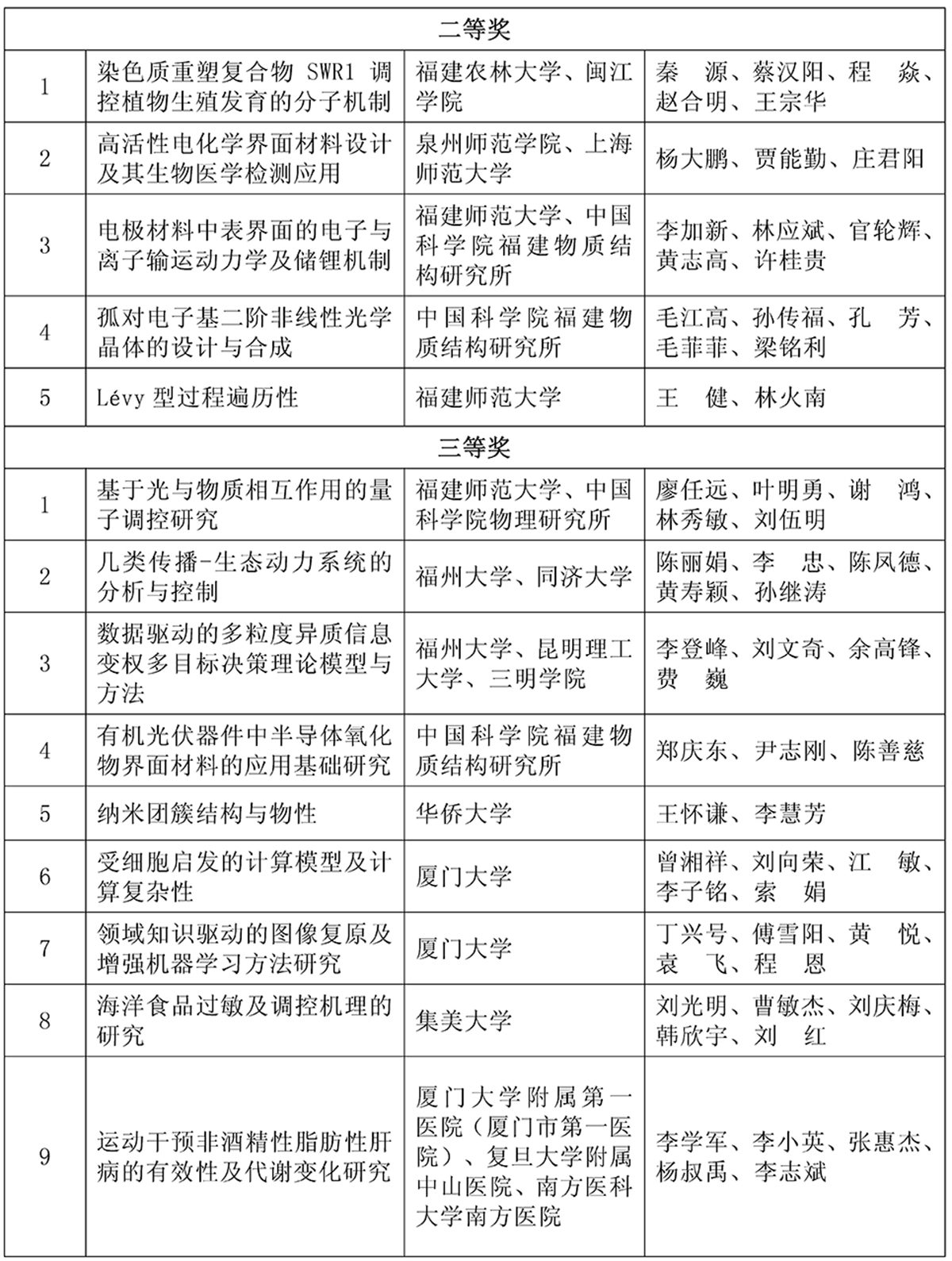 一、授予“快速磁共振波谱成像方法及应用”等3项成果福建省自然科学奖一等奖,授予“染色质重塑复合物SWR1调控植物生殖发育的分子机制”等5项成果福建省自然科学奖二等奖,授予“基于光与物质相互作用的量子调控研究”等9项成果福建省自然科学奖三等奖。