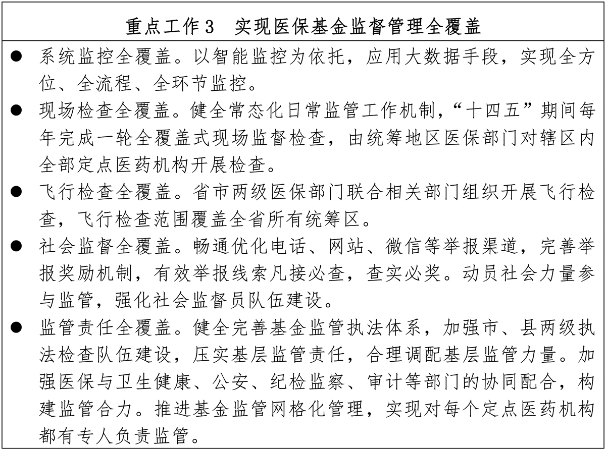 增强医保基金监管力度。创新监管方式,实行日常监管和专项治理相结合,综合运用信息化手段开展重点药品、医用耗材和诊疗项目的日常监管、预警分析,推动传统人工事后稽核模式向事前预警、事中控制和事后监管转变,推动医保基金全领域全流程监管。加强基金监管规范化建设,初步建立医保基金监管体系,制定举报奖励暂行实施办法、医保经办机构内控制度、重大案件集体审议工作规则,落实“双随机、一公开”监管制度和飞行检查等措施。建立全省医保信用体系,将医保定点医药机构、医保医师、药械企业、医保服务人员等涉及医保行为的各类主体纳入信用管理,探索引入第三方力量开展监管,构建多部门联动监管机制。加强基金监管能力建设,实施医保定点医药机构网格化监管和医保服务站现场监管,开展医保大数据监测评估,提升医保基金监测能力。持续开展打击欺诈骗保专项行动,保障医保基金安全。