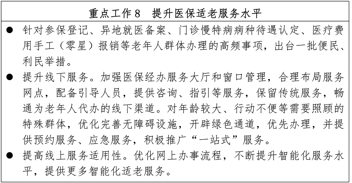 提升医保适老服务水平。加强医保经办服务大厅和窗口建设,合理布局服务网点,优化完善无障碍设施,开辟绿色通道,畅通为老年人代办的线下渠道。推进网上办事流程向提高适老性转变,支持老年人更多享受智能化成果,更好融入智能社会。
