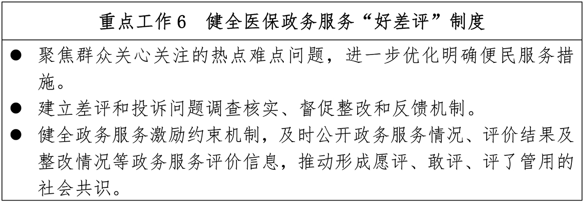 健全医保政务服务“好差评”制度。加快建立健全与医保发展相适应的医保政务服务评价标准体系和评价结果应用管理办法。聚集热点难点问题,优化明确便民服务措施。推进医保政务服务“好差评”示范区建设。