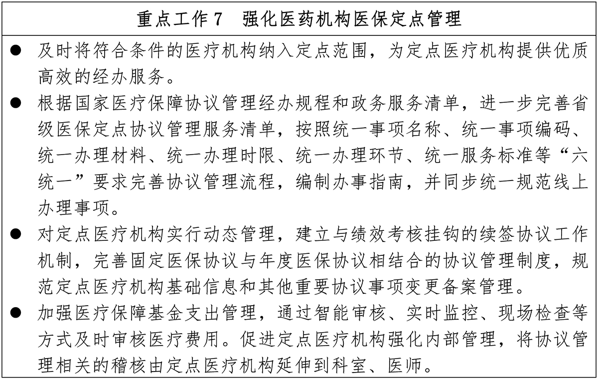 健全完善医保协议管理。落实国家定点医药机构管理办法,加强医保定点医药机构管理,简化优化医药机构定点申请、专业评估、协商谈判程序,统一规范并动态调整医保服务协议范本,加强事中事后监管。建立健全跨区域就医协议管理机制。适应人口老龄化、群众多元医疗需求,将符合条件的各类医药机构纳入医保定点,支持“互联网+”医药服务等新业态医药服务发展。推动定点医药机构医保精细化管理,建立考核评价及退出机制,加强绩效考核结果与应用挂钩。