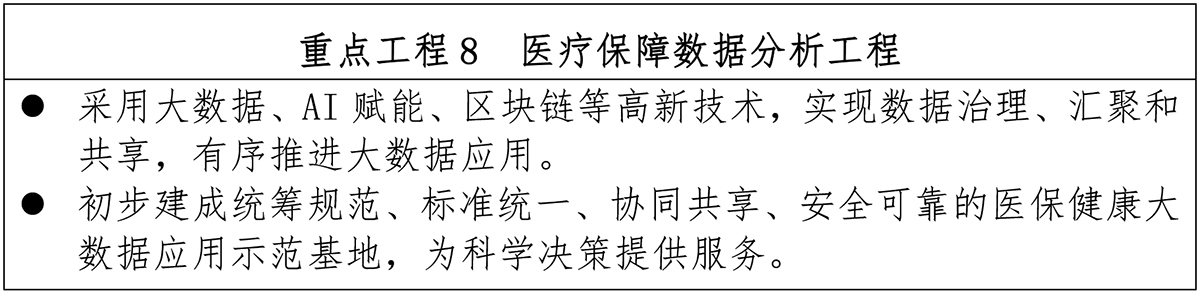 建设安全医保。统筹发展和安全取得积极成效,防范化解因病致贫返贫长效机制基本建立,医保安全网更加密实,基金运行更加安全稳健,群众安全感得到提升,医保信息平台安全运行,数据安全管理持续强化。