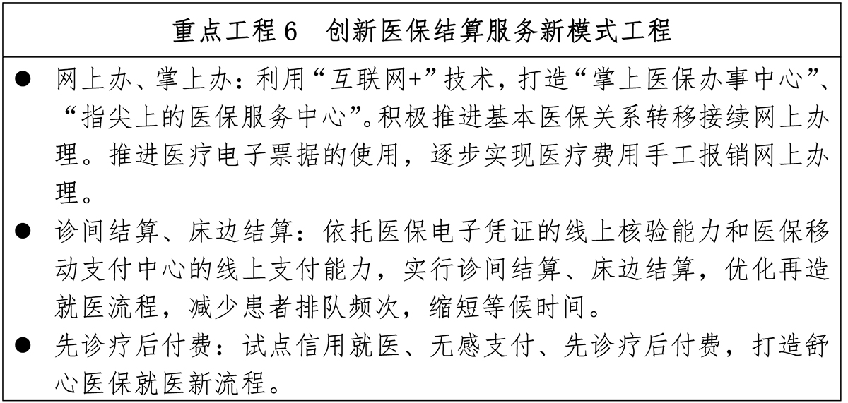 建设智慧医保。医保管理服务信息化、数字化、智能化水平显著提升,医保电子凭证普遍推广,智能监控全面应用,传统服务方式和线上服务方式共同发展,就医结算更加便捷,医保服务让人民更加满意。