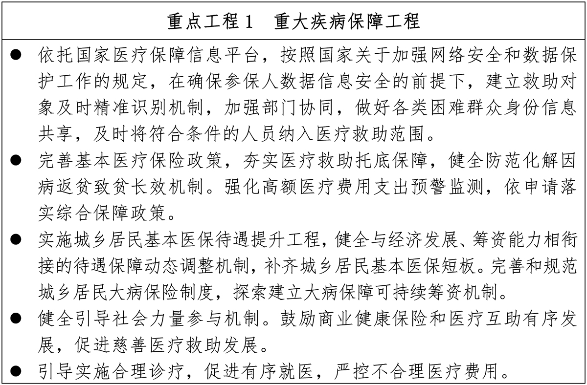 建设公平医保。基本医保更加规范统一,各方责任更加均衡,待遇保障更加公平普惠,保障范围和标准与经济社会发展水平更加适应,制度间、人群间、地区间差距逐步缩小,缴费进一步均衡,待遇清单制度有序实施,住院保障水平稳中有升,门诊共济保障能力明显提升,医疗救助、重大疫情医疗救治费用保障等托底保障功能持续增强,公共服务体系更加健全,医保公共服务可及性显著提高。