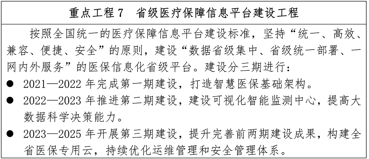 建设医保信息化省级平台。按照全国统一的医疗保障信息平台建设标准,坚持“统一、高效、兼容、便捷、安全”的原则,分期开展省级医保信息平台建设,实现“数据省级集中、省级统一部署、一网内外服务”的建设目标。
