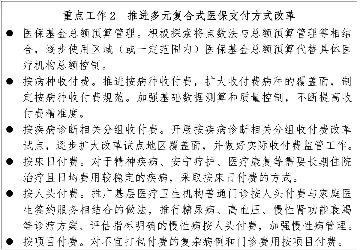 完善多元复合式支付方式。在全省范围内普遍实施住院按病种收付费为主的适应不同疾病、不同服务特点的多元复合式收付费方式。按照“分步实施、分层推进”的思路,在具备实施条件的公立医院开展DRG收付费改革试点,其他公立医院全面推进住院按病种收付费改革。加快推进南平市DRG付费国家试点和厦门、宁德、莆田、龙岩等4个地市区域点数法总额预算和按病种分值付费(DIP)试点等工作。加强运行监测和评估,强化政策配套和技术支撑,实现住院按病种收付费为主的复合式支付方式改革全覆盖,并逐步将收付费方式改革从住院向门诊延伸。总结提升推广三明医改经验,不断完善医共体医保打包支付政策。总结推广家庭医生签约服务与按人头付费有效做法,积极探索更好发挥中医药特色优势的中医优势病种支付方式。增强支付方式改革与医疗服务协同性,引导医疗机构主动控制成本,严控目录外不合理费用增长。开展各种支付方式绩效和价值评估。