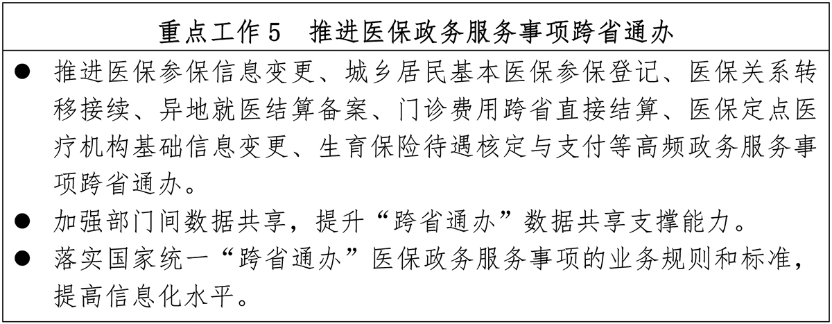 提升公共服务水平。坚持传统服务方式和新型服务方式相结合,推进政务服务事项网上办理。构建多种形式的医保公共管理服务平台,推进医保经办窗口标准化建设、医保在线公共服务平台建设、医保服务站建设,探索实施医保服务“视频办”。建立健全省内跨区域医保管理服务协作机制,推进全国高频政务服务“跨省通办”医保服务事项落地实施,重点推进跨区域医保公共服务管理一体化。