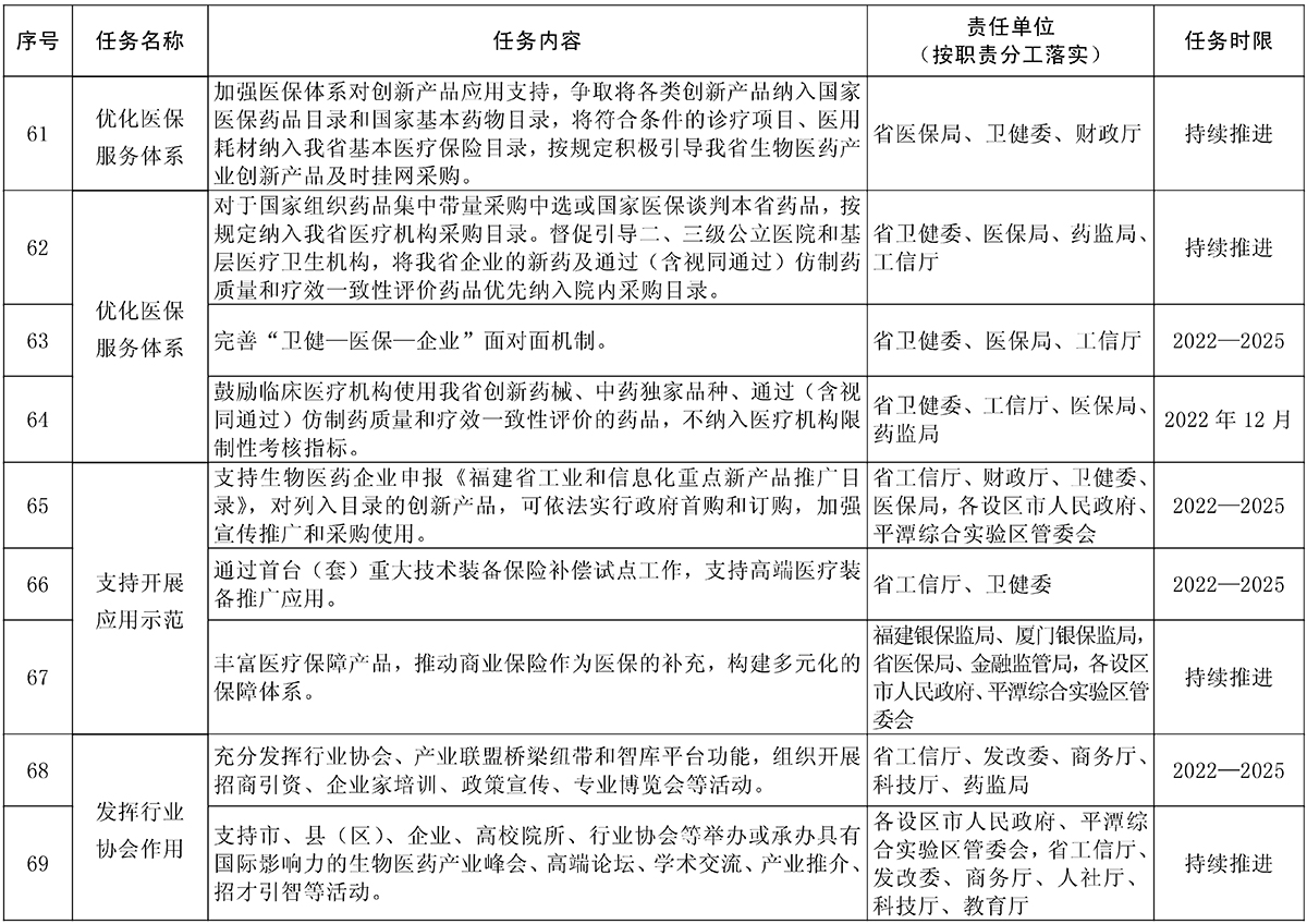 责任单位:省工信厅、卫健委、医保局、药监局、财政厅、金融监管局,福建银保监局、厦门银保监局,各设区市人民政府、平潭综合实验区管委会
