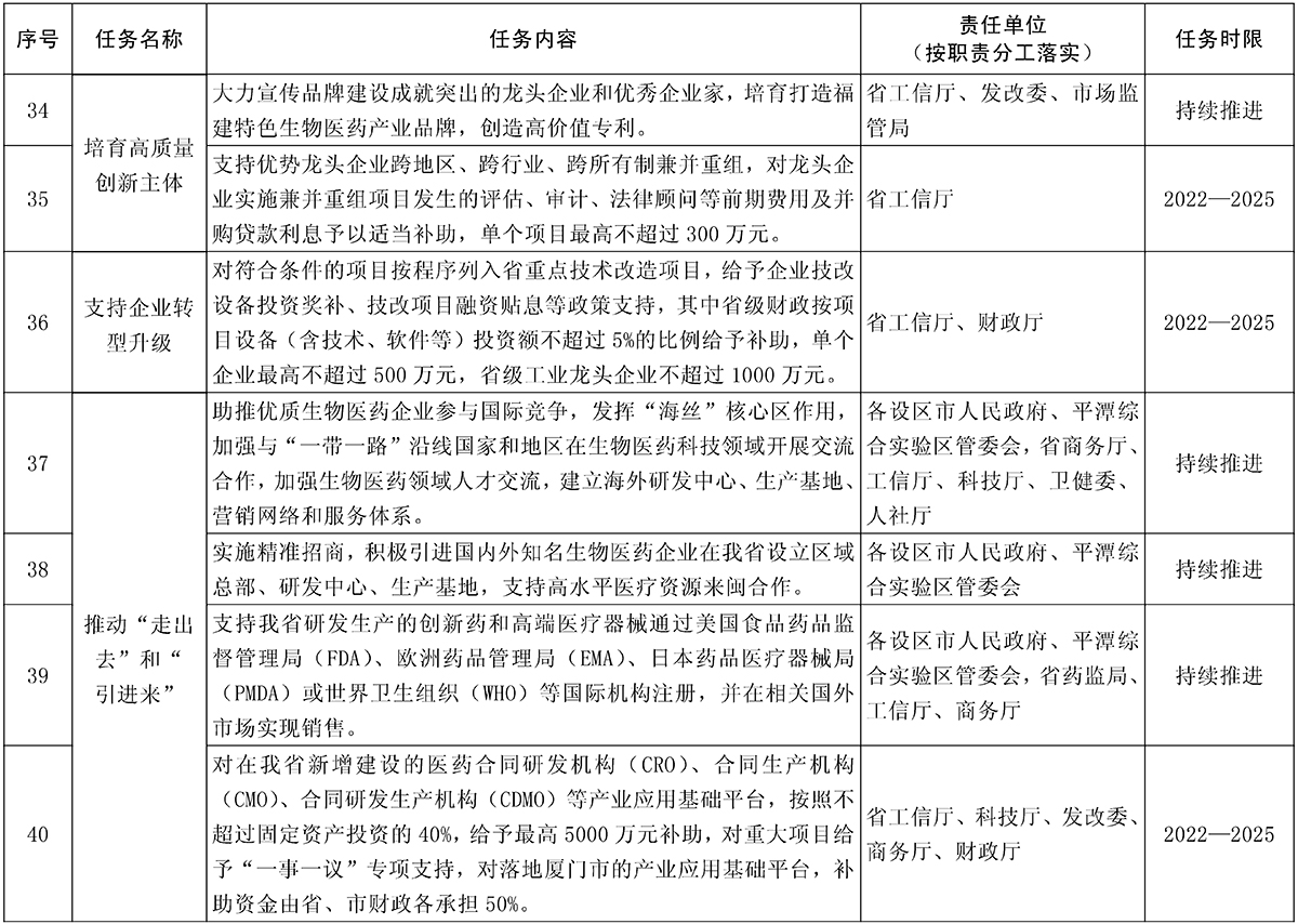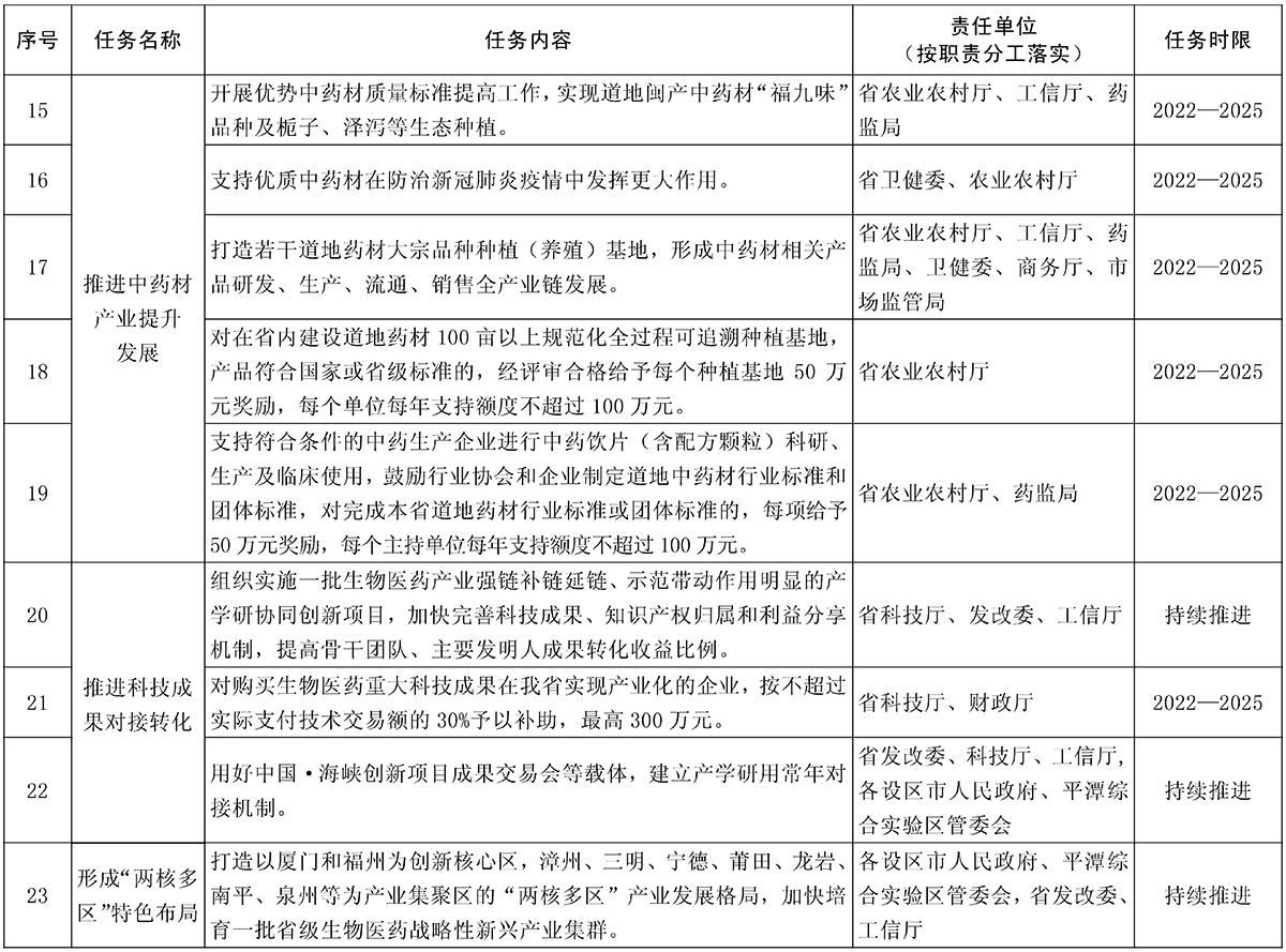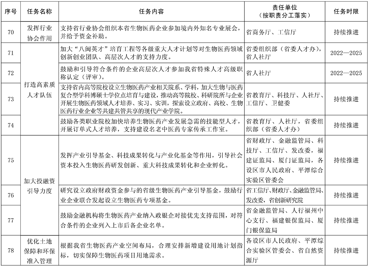 责任单位:省工信厅、发改委、商务厅、人社厅、科技厅、药监局、教育厅,各设区市人民政府、平潭综合实验区管委会