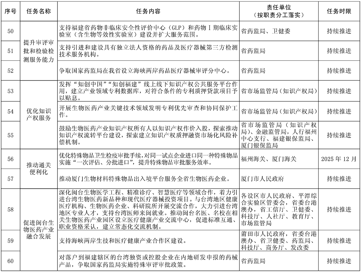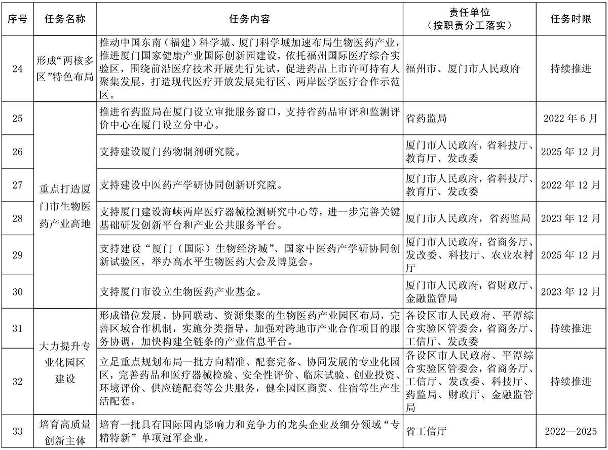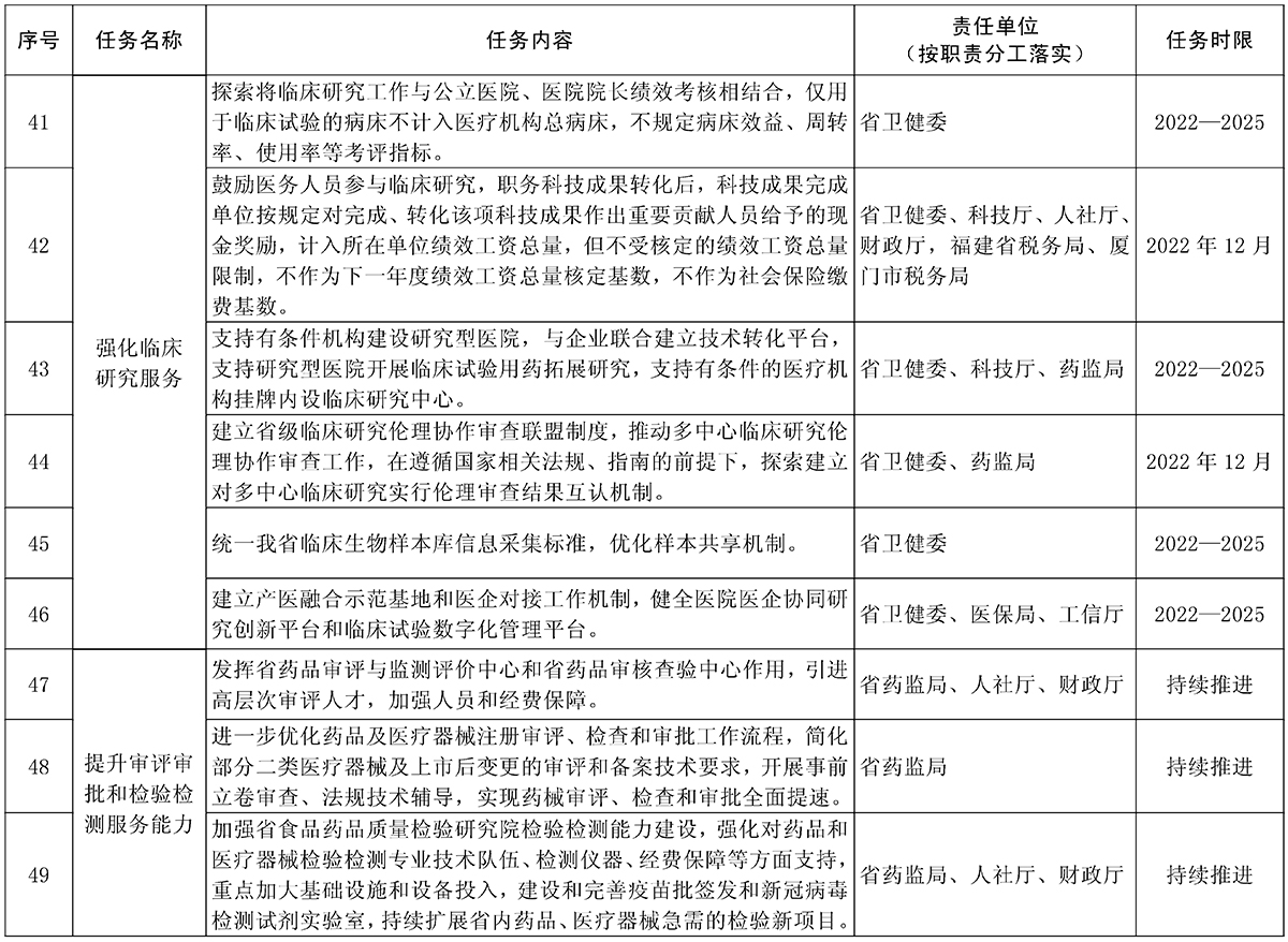 责任单位:省卫健委、科技厅、医保局、药监局、人社厅、财政厅、工信厅,福建省税务局、厦门市税务局