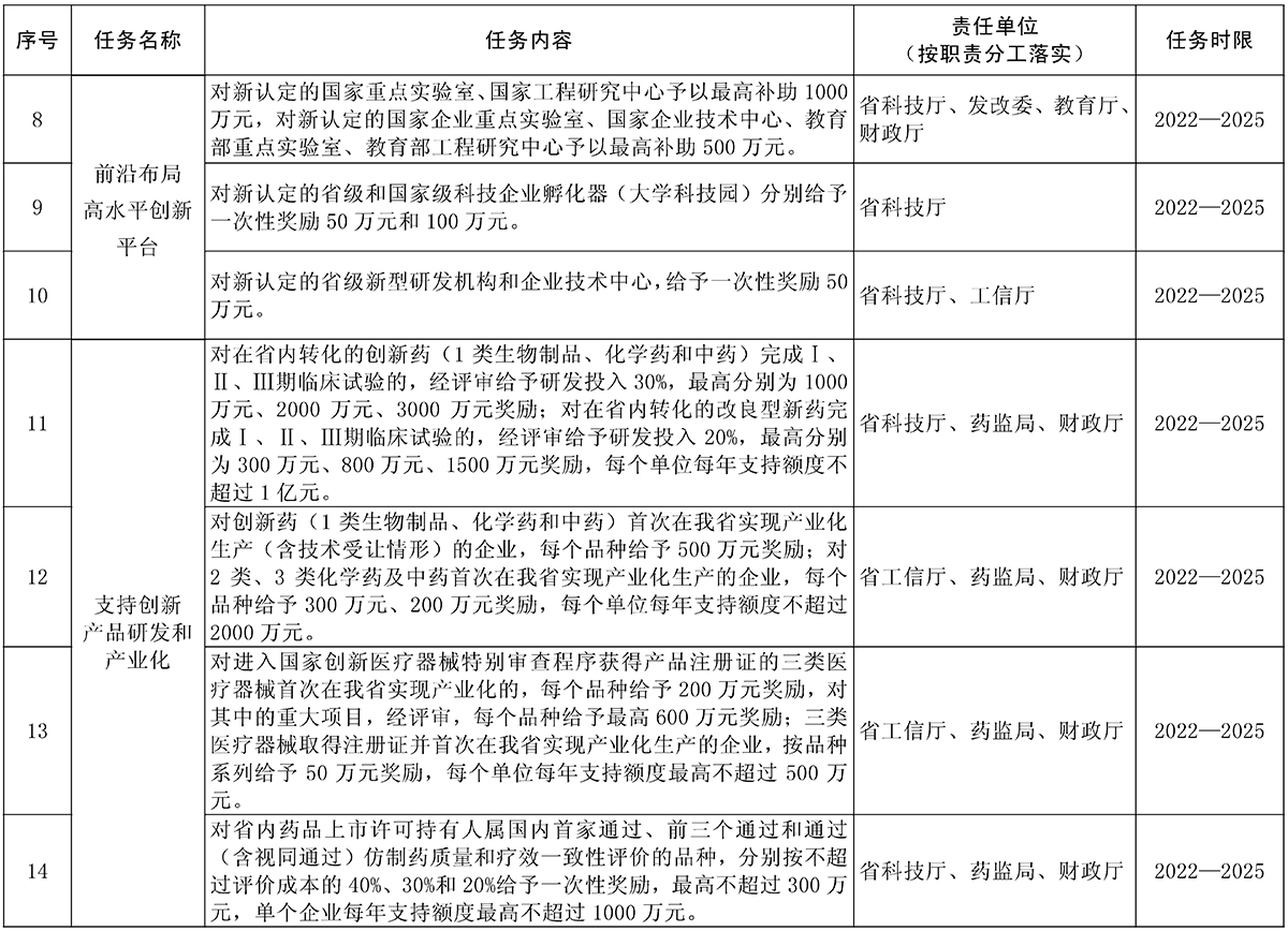 责任单位:省科技厅、财政厅、卫健委、工信厅、发改委、药监局